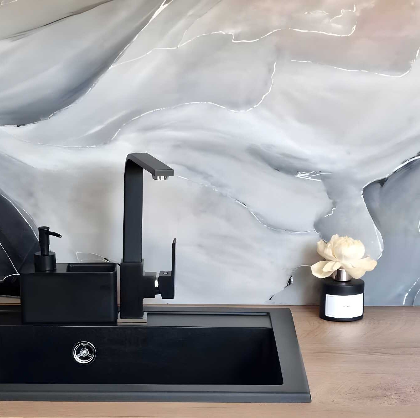 A képen látható konyhában a falat nem csempe fedi, hanem egy egyedi, absztrakt festmény, amelyet epoxi gyanta réteg véd. Az epoxi bevonat nemcsak magasfényű, hanem rendkívül ellenálló is – nem törik, nem karcolódik, könnyen tisztítható, és ugyanúgy viselkedik, mint a klasszikus kerámia csempe.