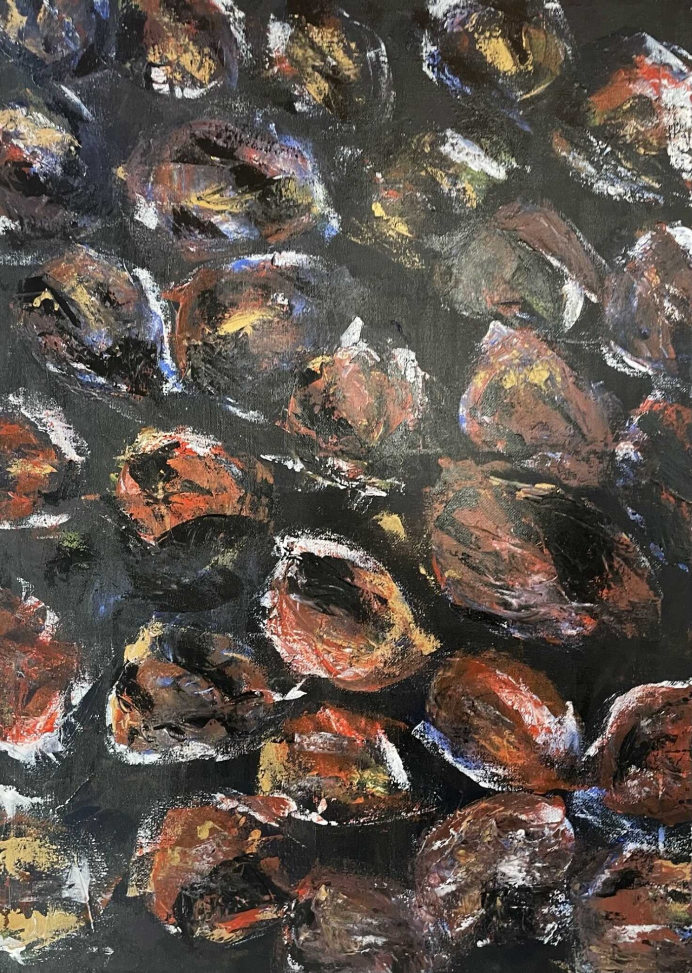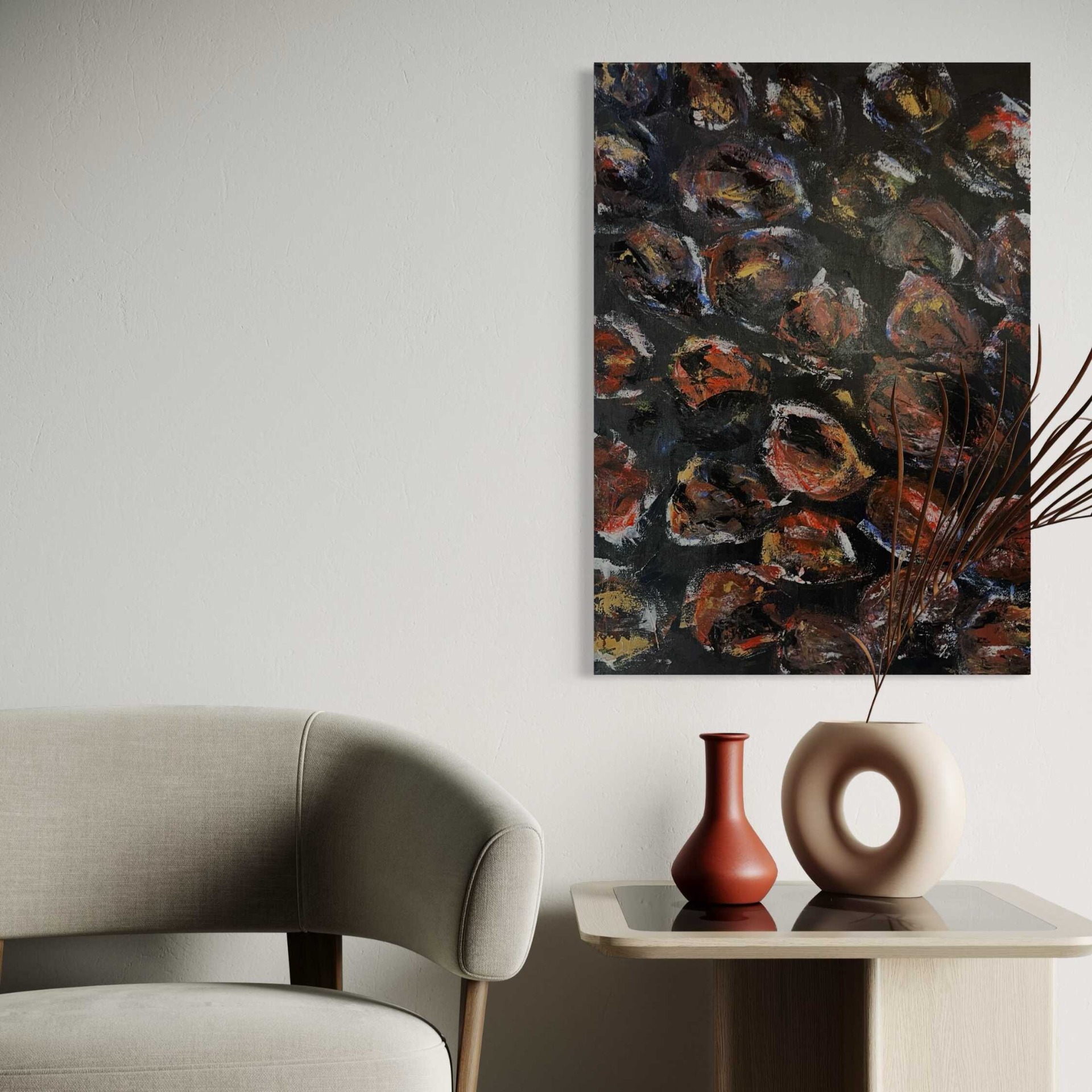 Az "Aszúszemek" című mű egy eredeti, kézzel festett absztrakt festmény. A fekete, piros és arany árnyalatok harmonikusan illeszkednek modern és minimalista enteriőrökhöz.