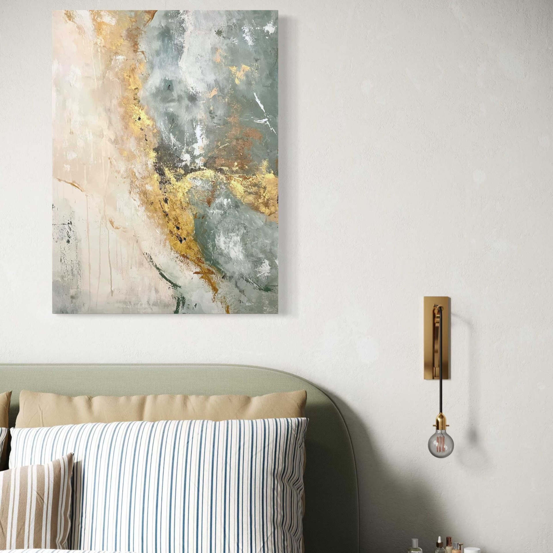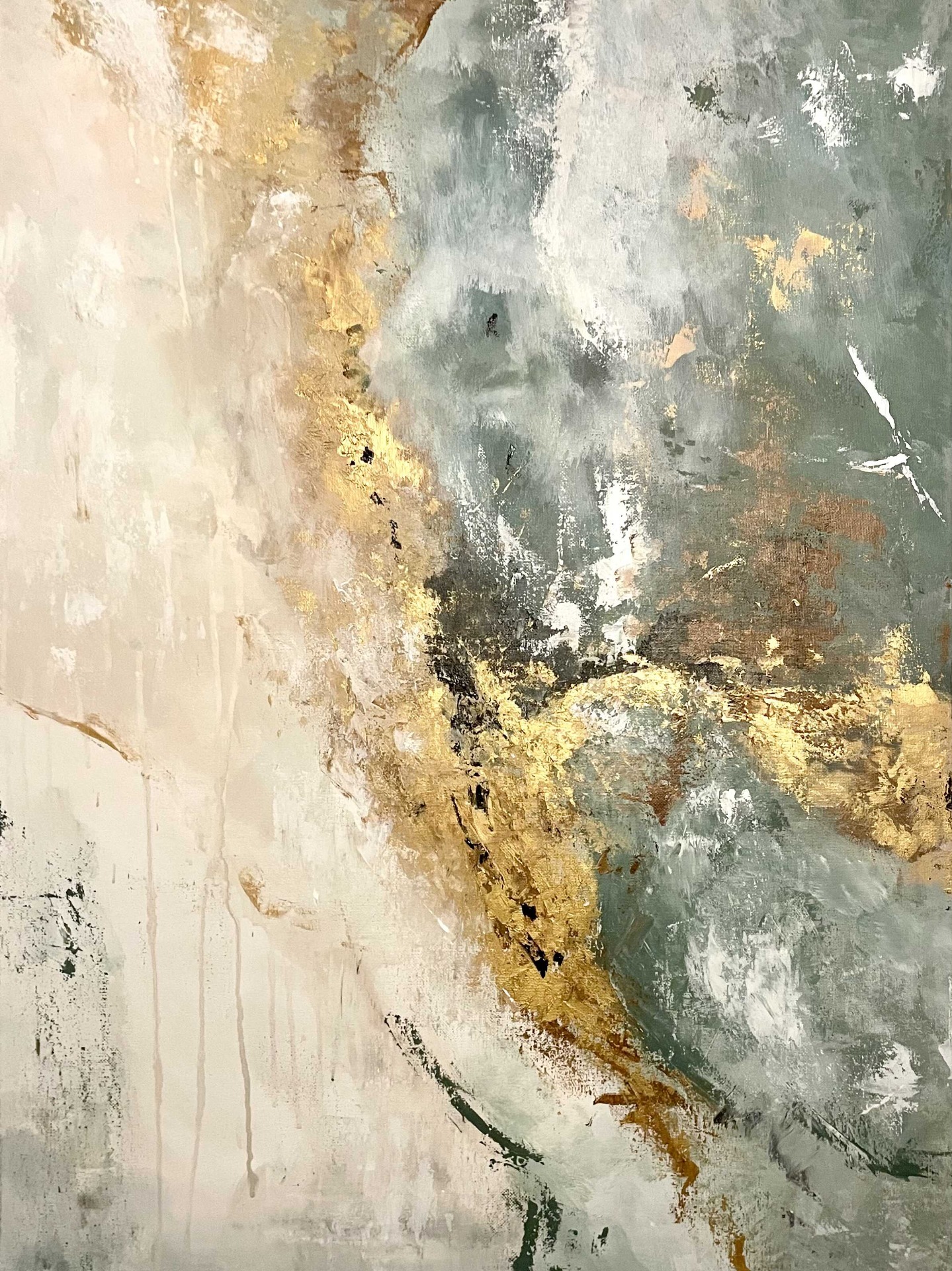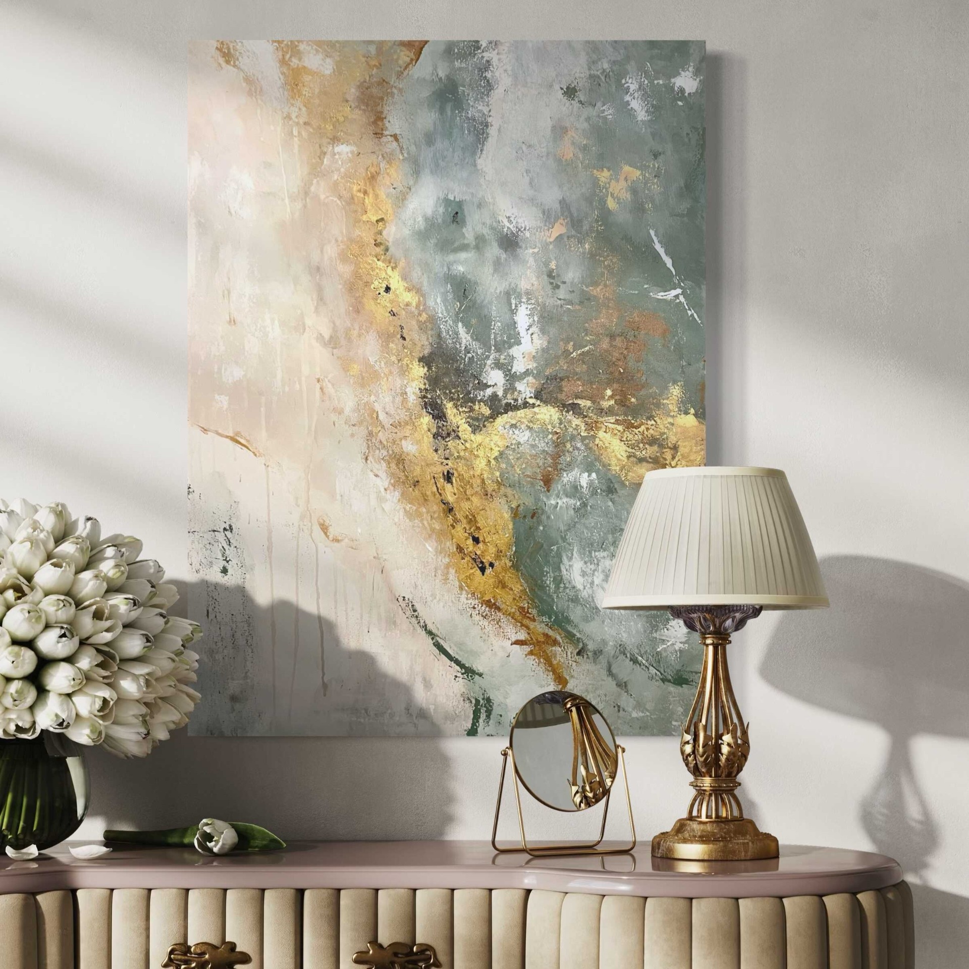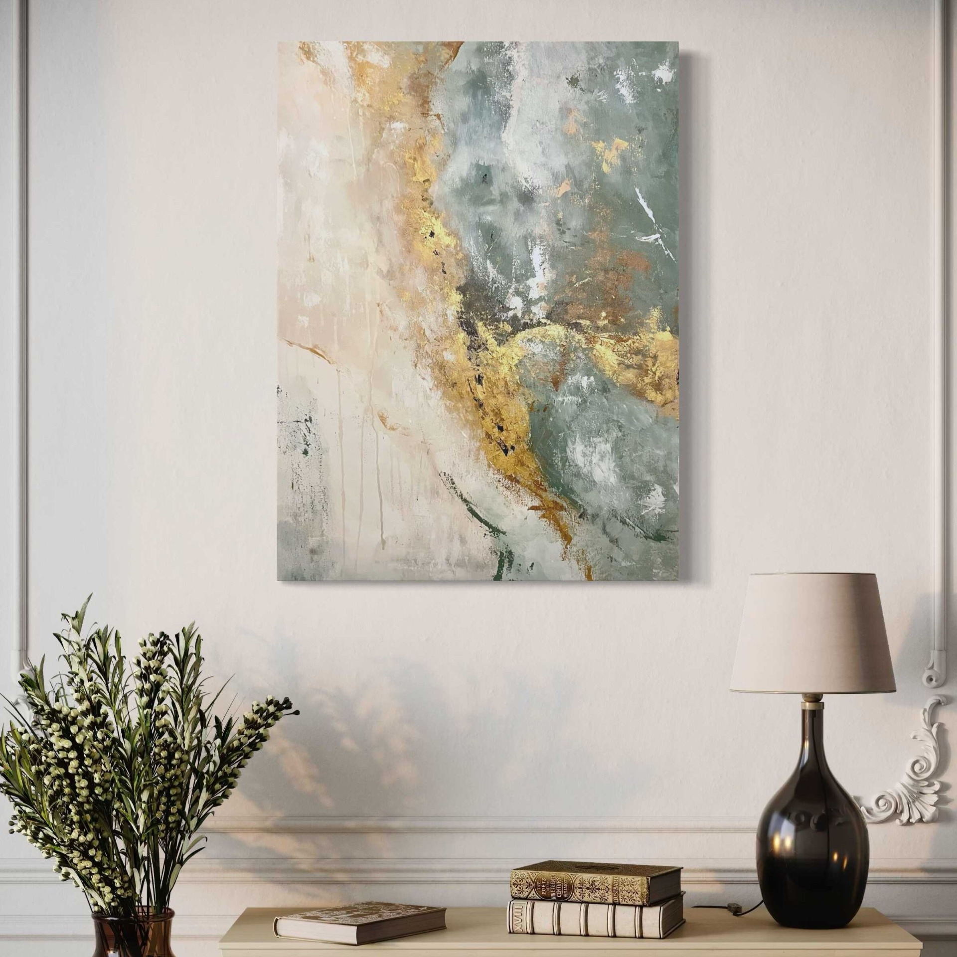 Az "Avar" című mű egy eredeti, kézzel festett absztrakt festmény. A zöld, bézs és arany árnyalatok harmonikusan illeszkednek modern és minimalista enteriőrökhöz.