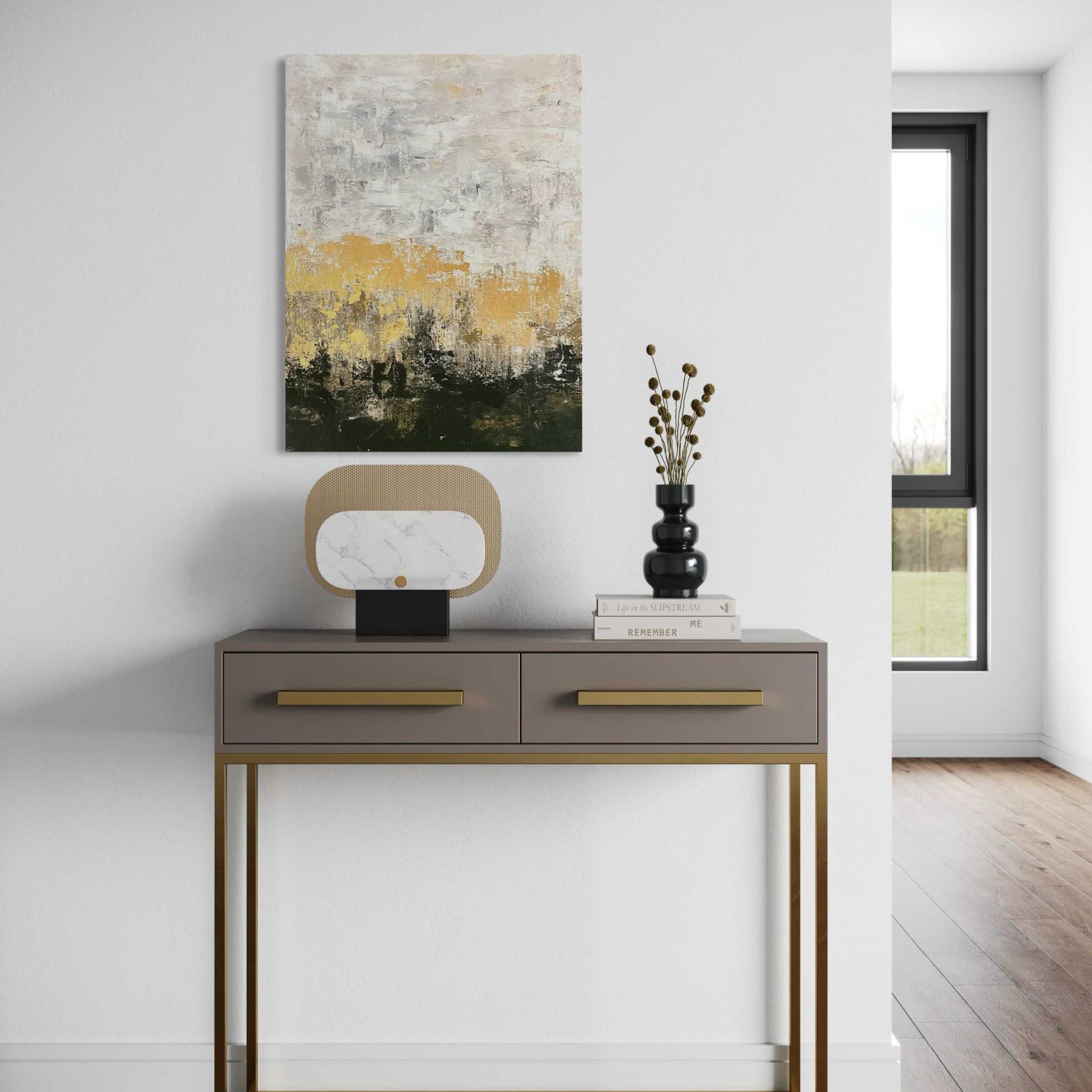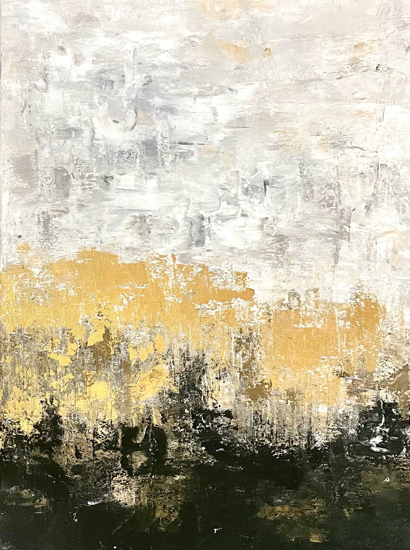 A "Domb" című mű egy eredeti, kézzel festett absztrakt festmény. A fekete, fehér és arany árnyalatok harmonikusan illeszkednek modern és minimalista enteriőrökhöz.