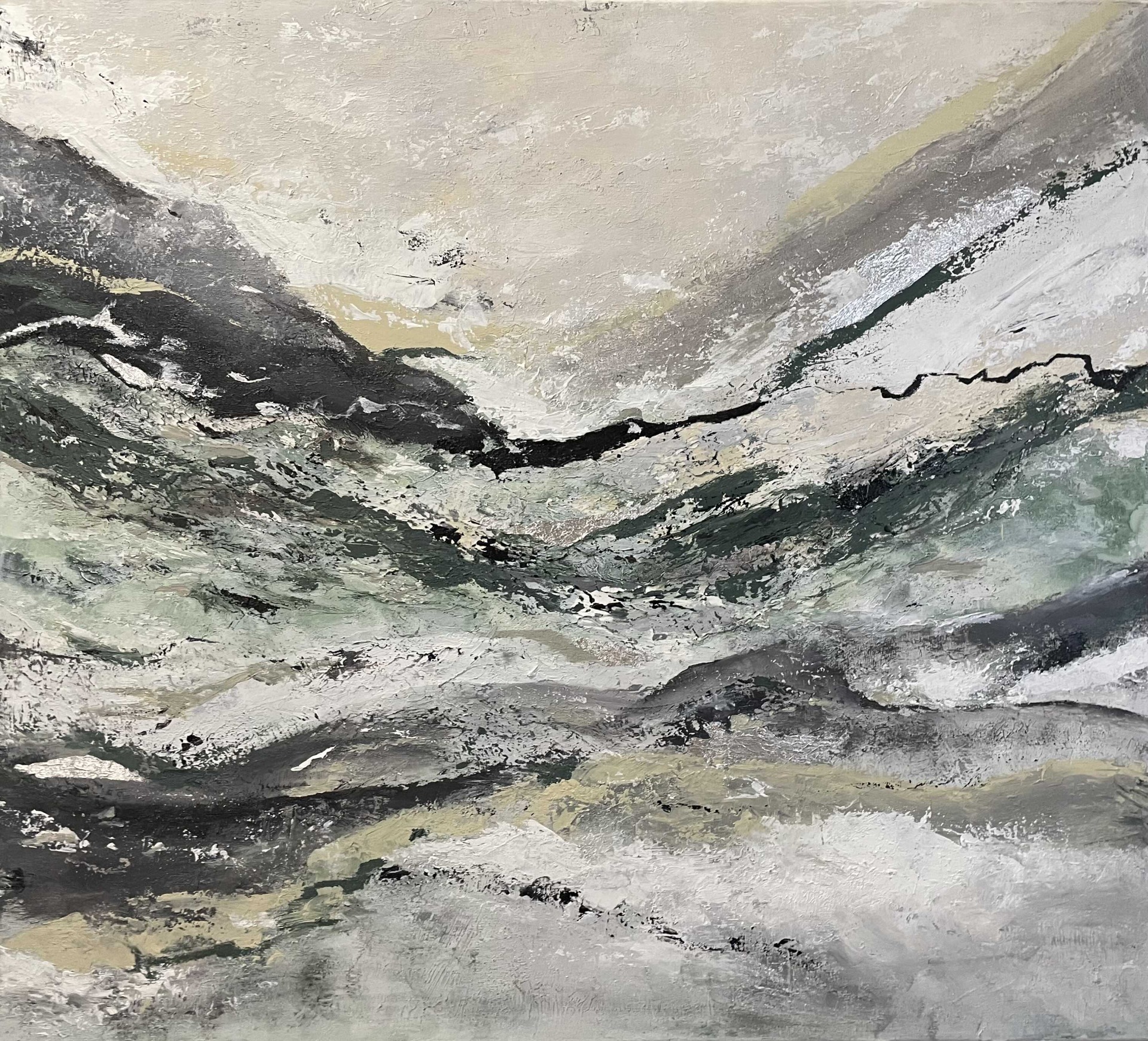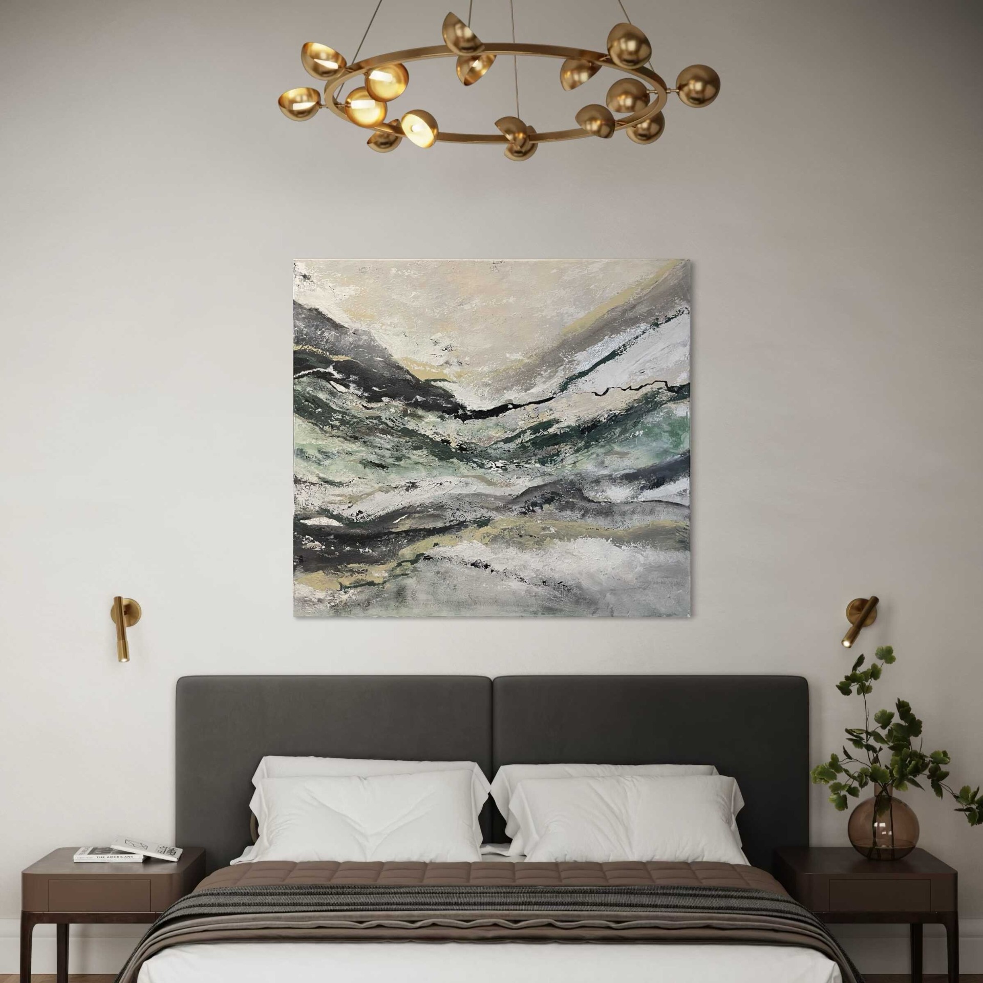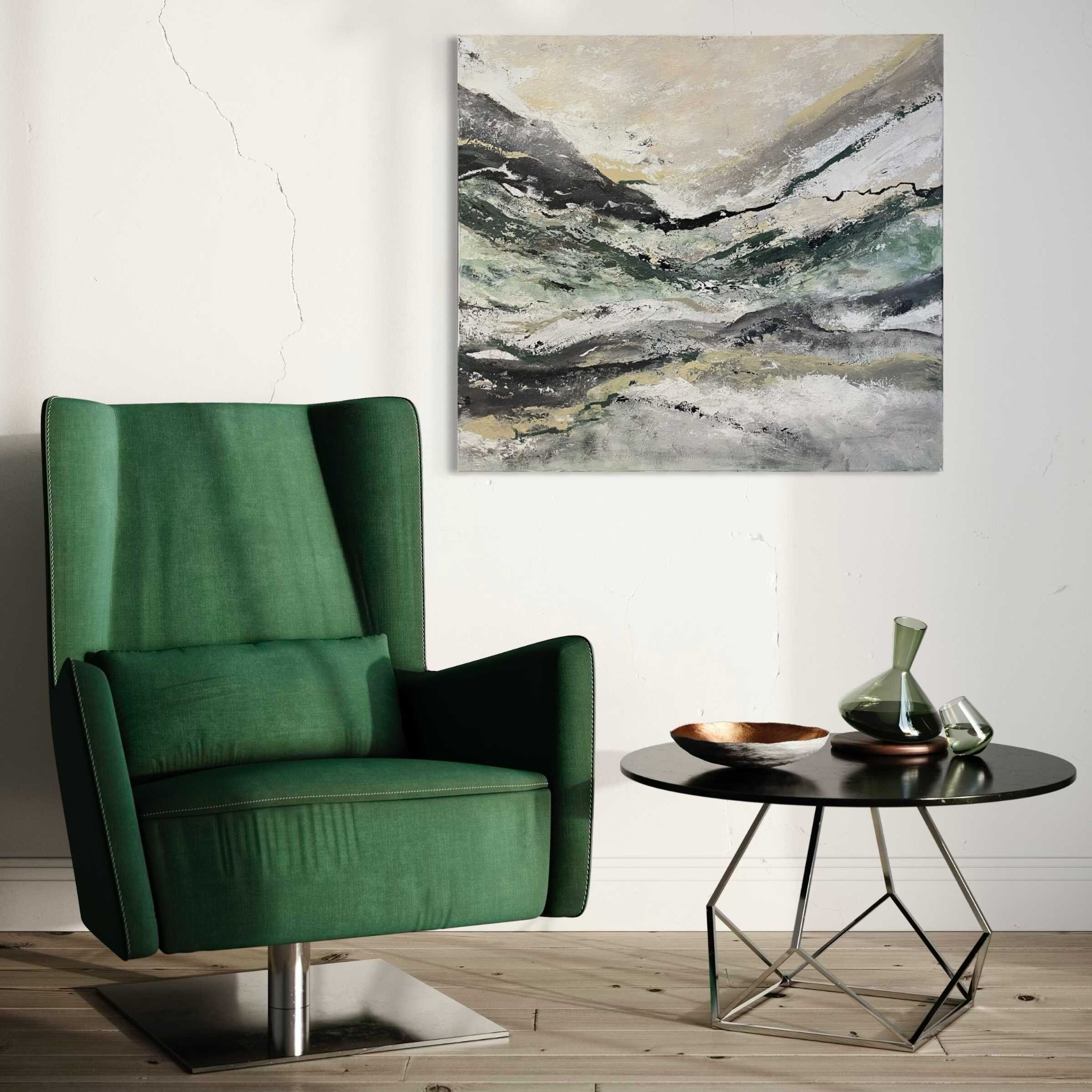 A "Gleccser" című mű egy eredeti, kézzel festett absztrakt festmény. A zöld, fehér és ezüst árnyalatok harmonikusan illeszkednek modern és minimalista enteriőrökhöz.