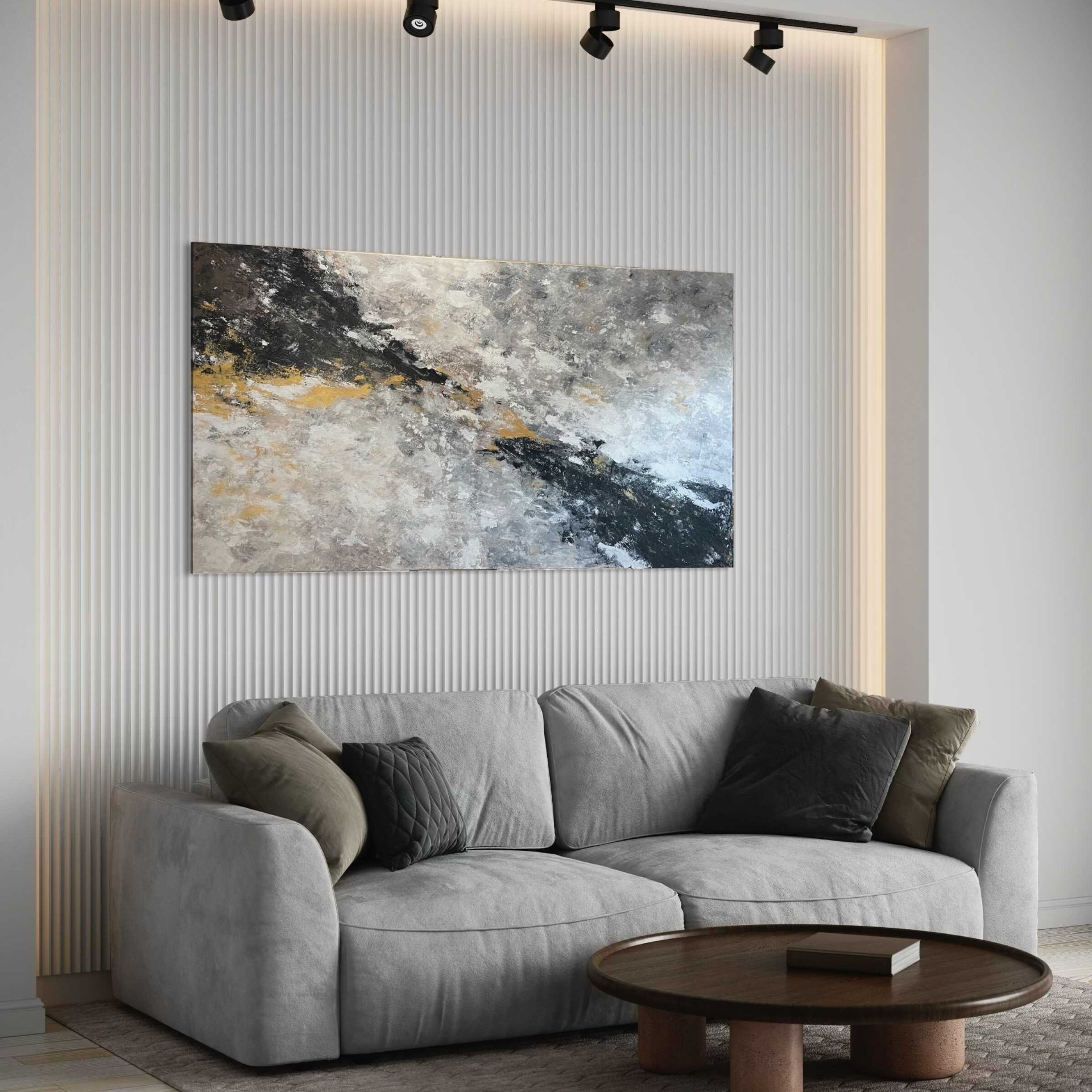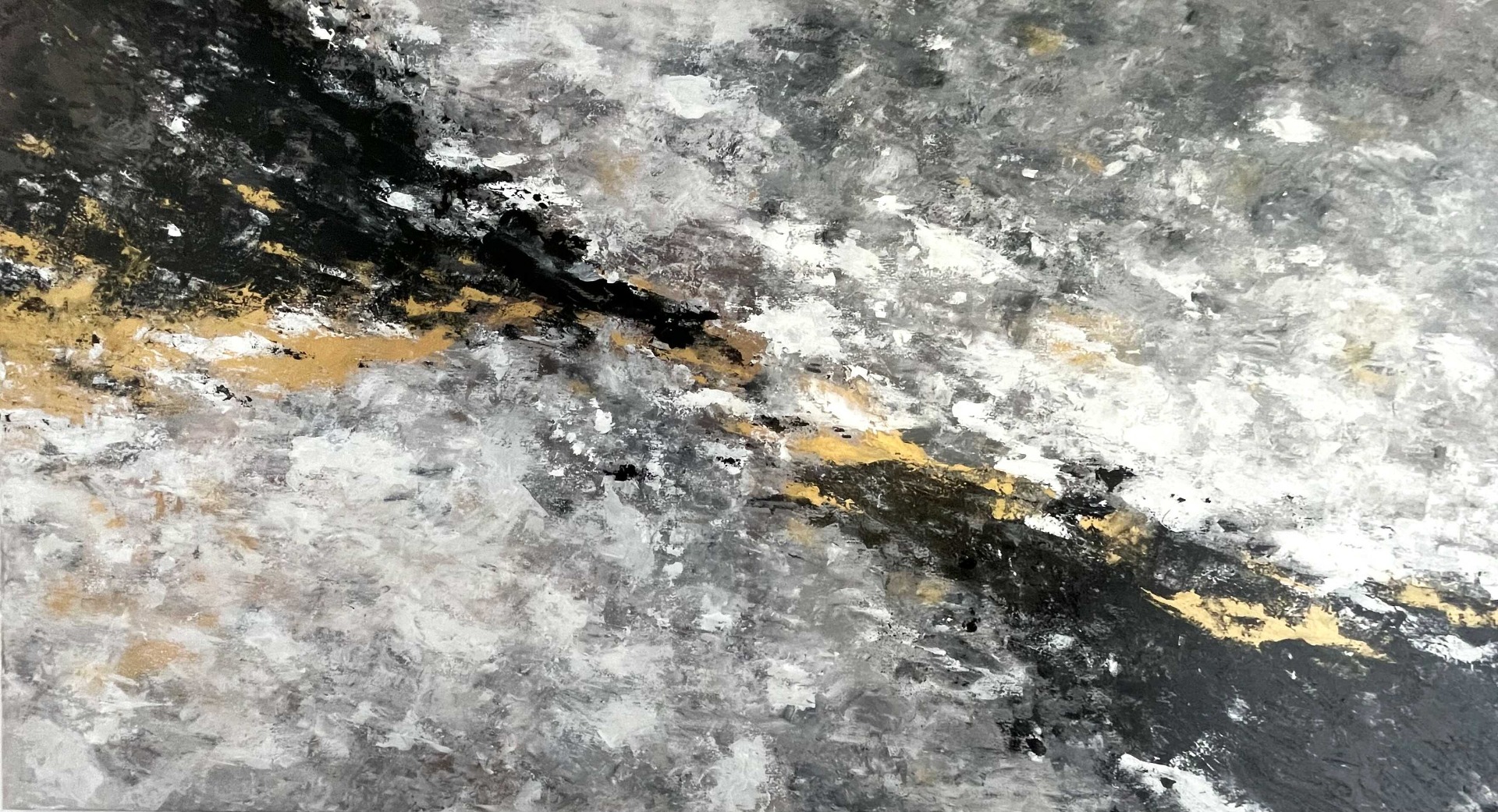 A "Fénypermet" című mű egy eredeti, kézzel festett absztrakt festmény. A fekete, fehér és arany árnyalatok harmonikusan illeszkednek modern és minimalista enteriőrökhöz.