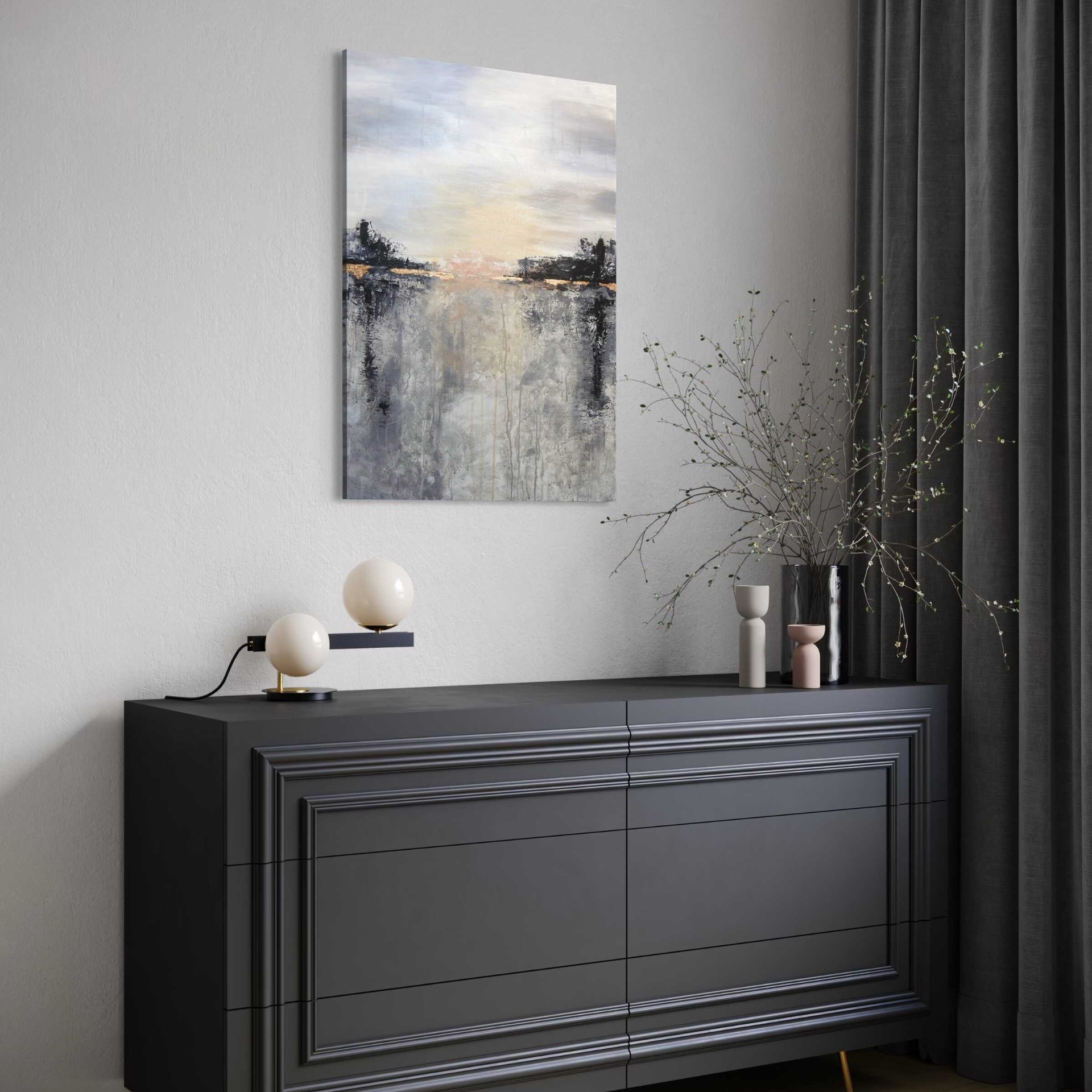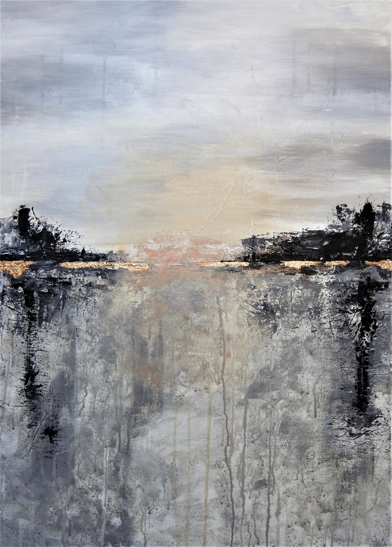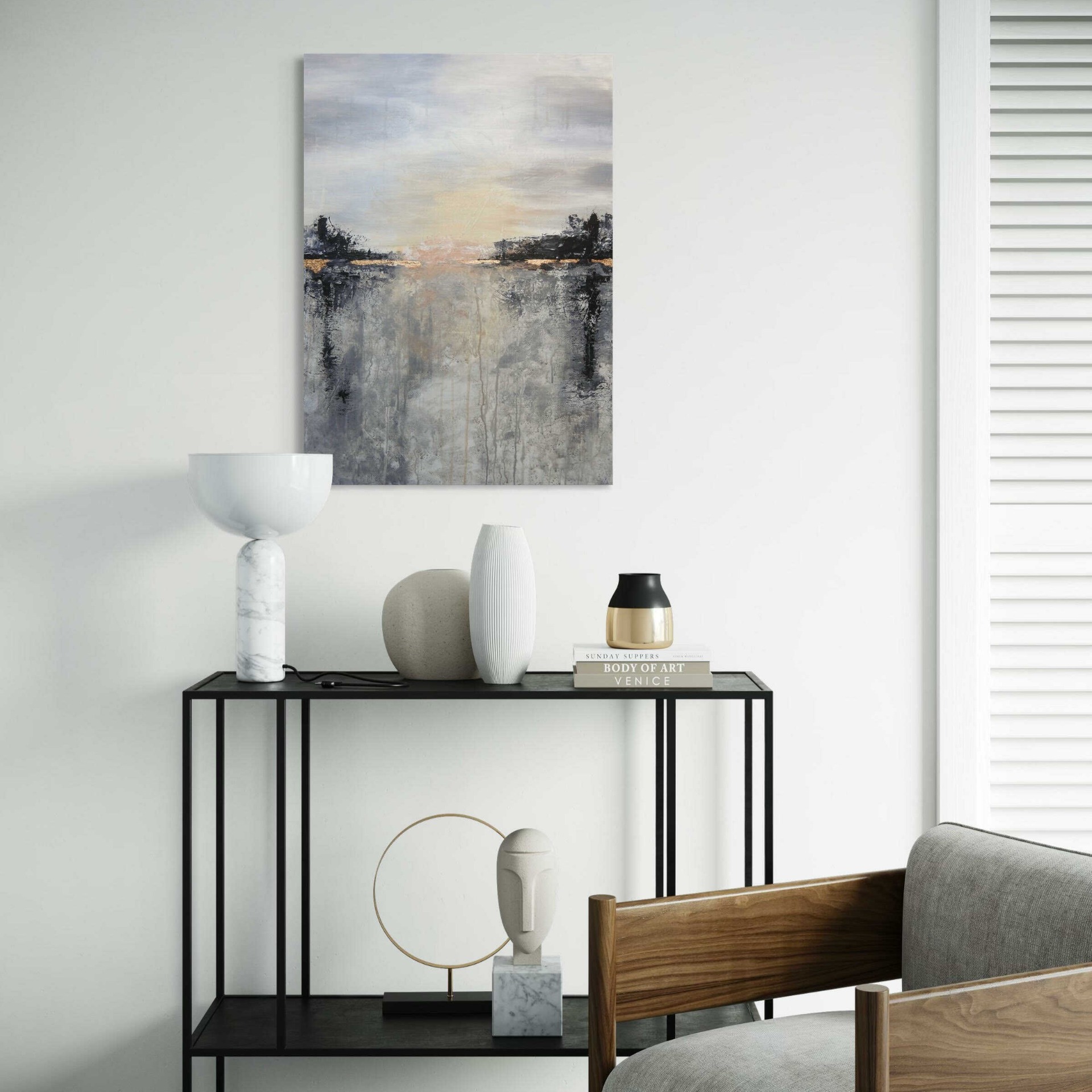 A "Hajnal" című mű egy eredeti, kézzel festett absztrakt festmény. A fekete, fehér és szürke árnyalatok harmonikusan illeszkednek modern és minimalista enteriőrökhöz.