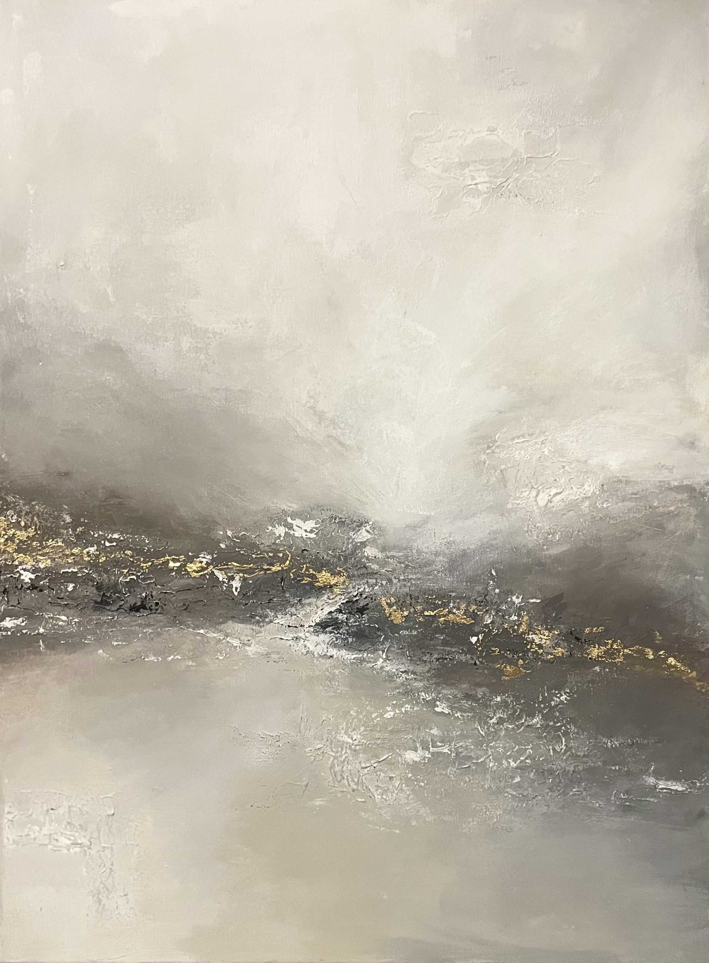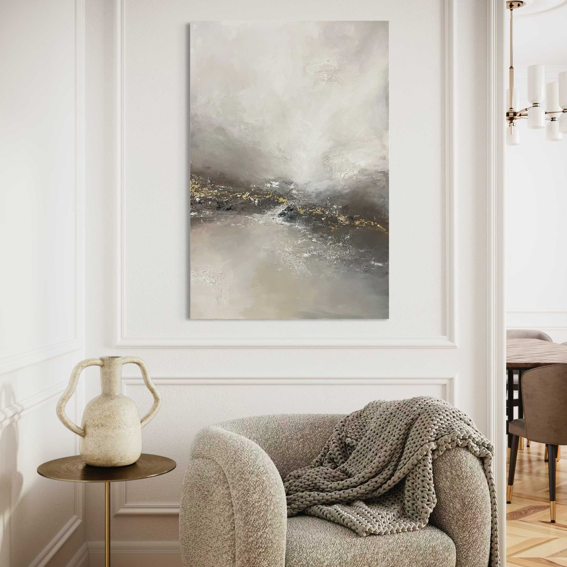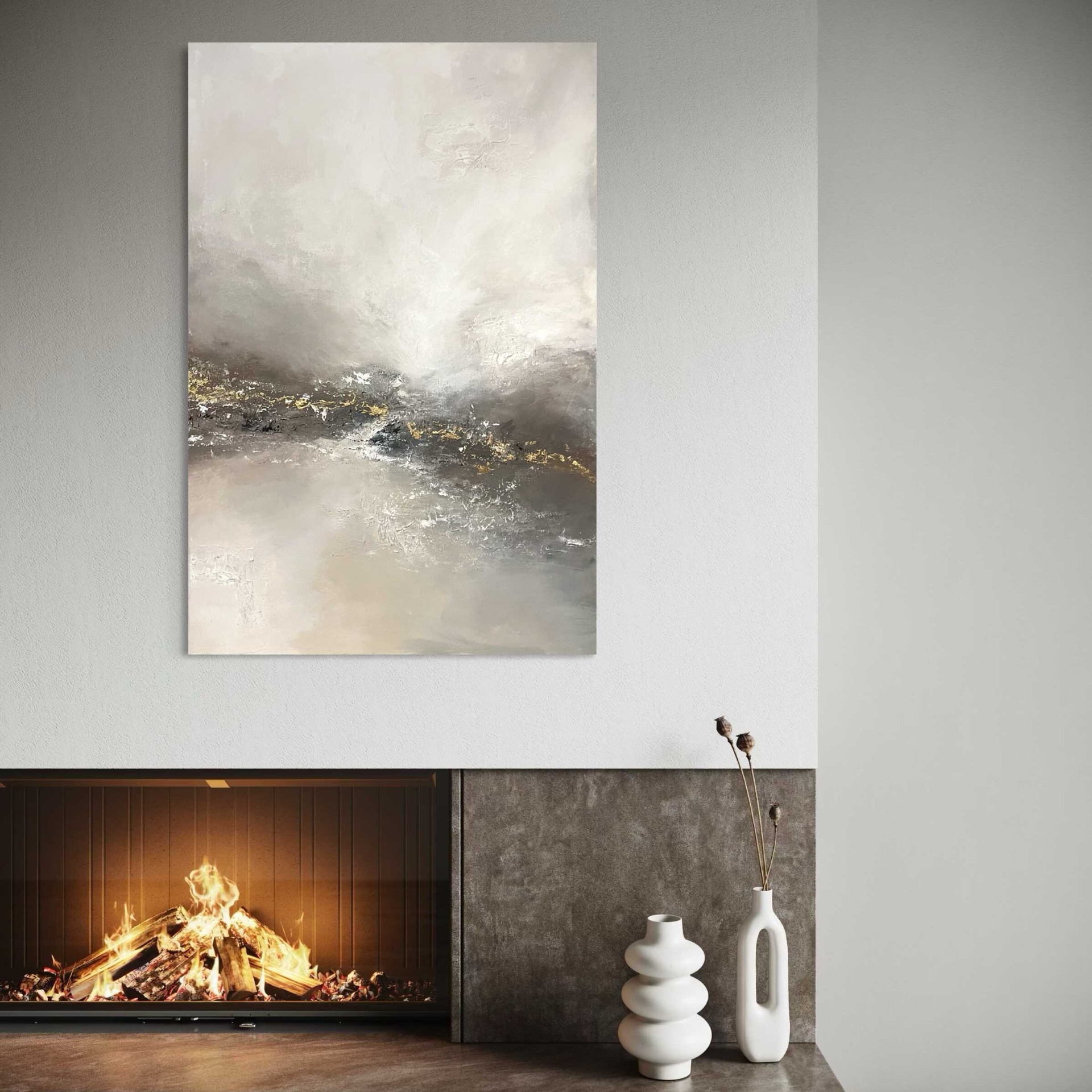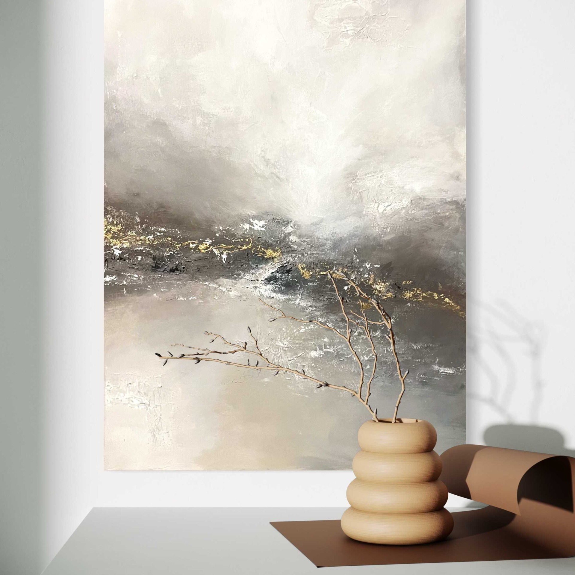 A krémes fehér, bézs és szürkés árnyalatok harmonikusan olvadnak össze, miközben a strukturált felületen megjelenő aranyfólia finom hangsúlyt és mélységet ad az alkotásnak.