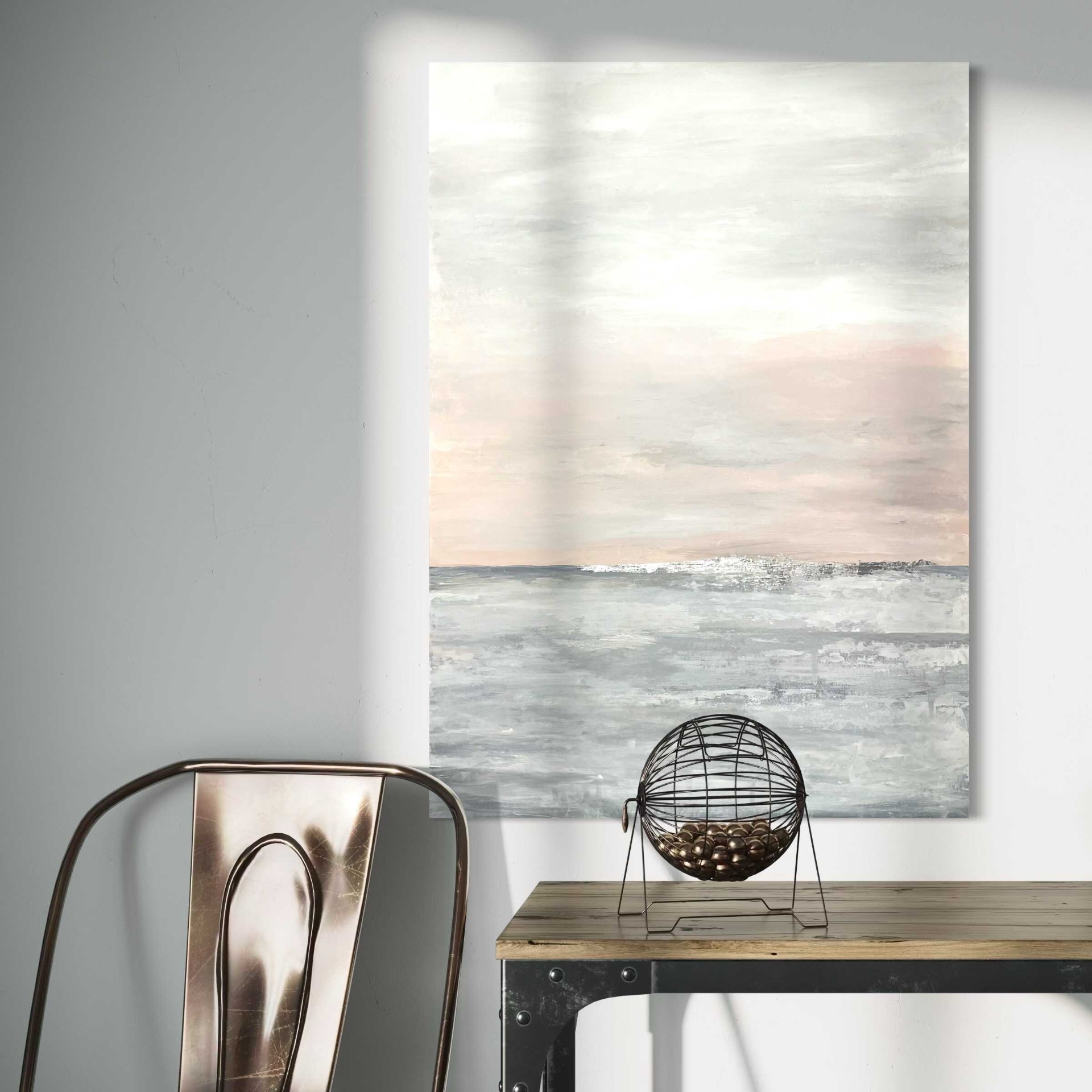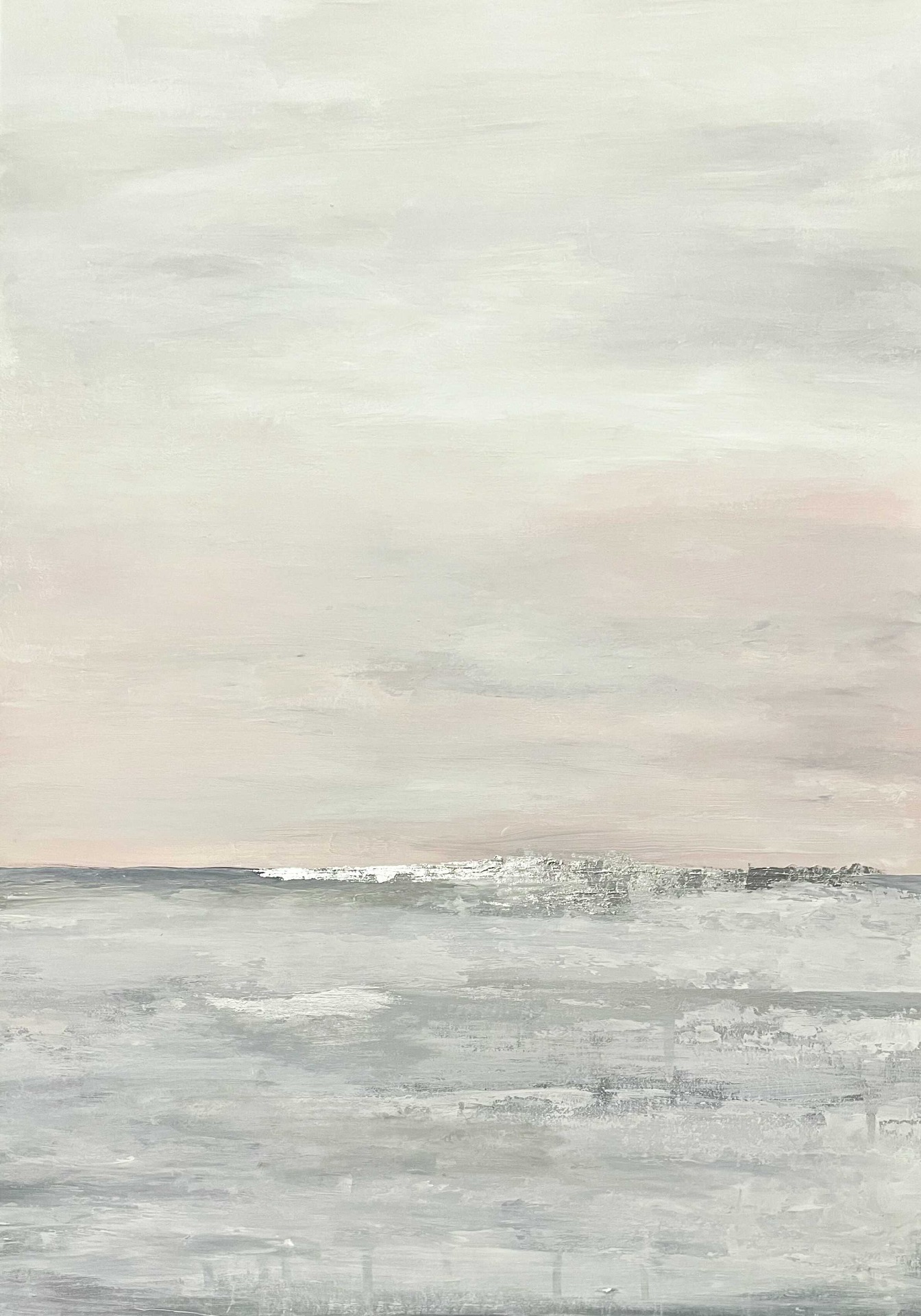 Ez a modern absztrakt festmény finom, pasztelles színvilágával nyugodt, kiegyensúlyozott hangulatot teremt a térben. A világos szürke, törtfehér és halvány rózsaszínes árnyalatok lágy rétegekben épülnek egymásra, letisztult, levegős összhatást adva az alkotásnak.