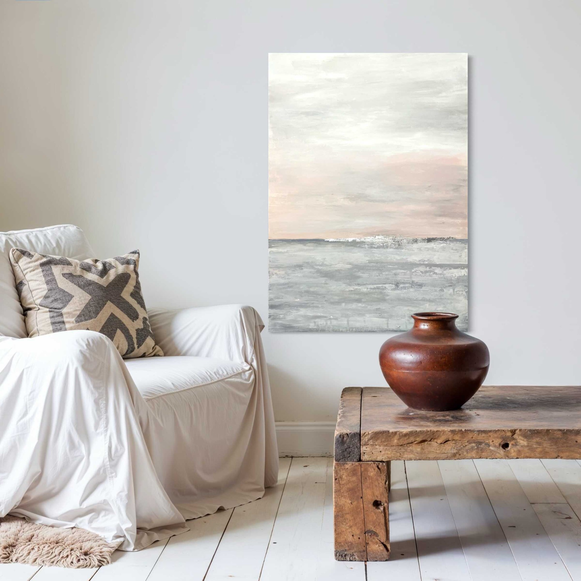 A horizontális kompozíció és a visszafogott textúrák tájképszerű érzetet keltenek, miközben a festmény megmarad absztrakt formanyelvnél. Időtálló, elegáns darab, amely nem uralja a teret, mégis karaktert ad neki – ideális választás modern, világos enteriőrökbe.