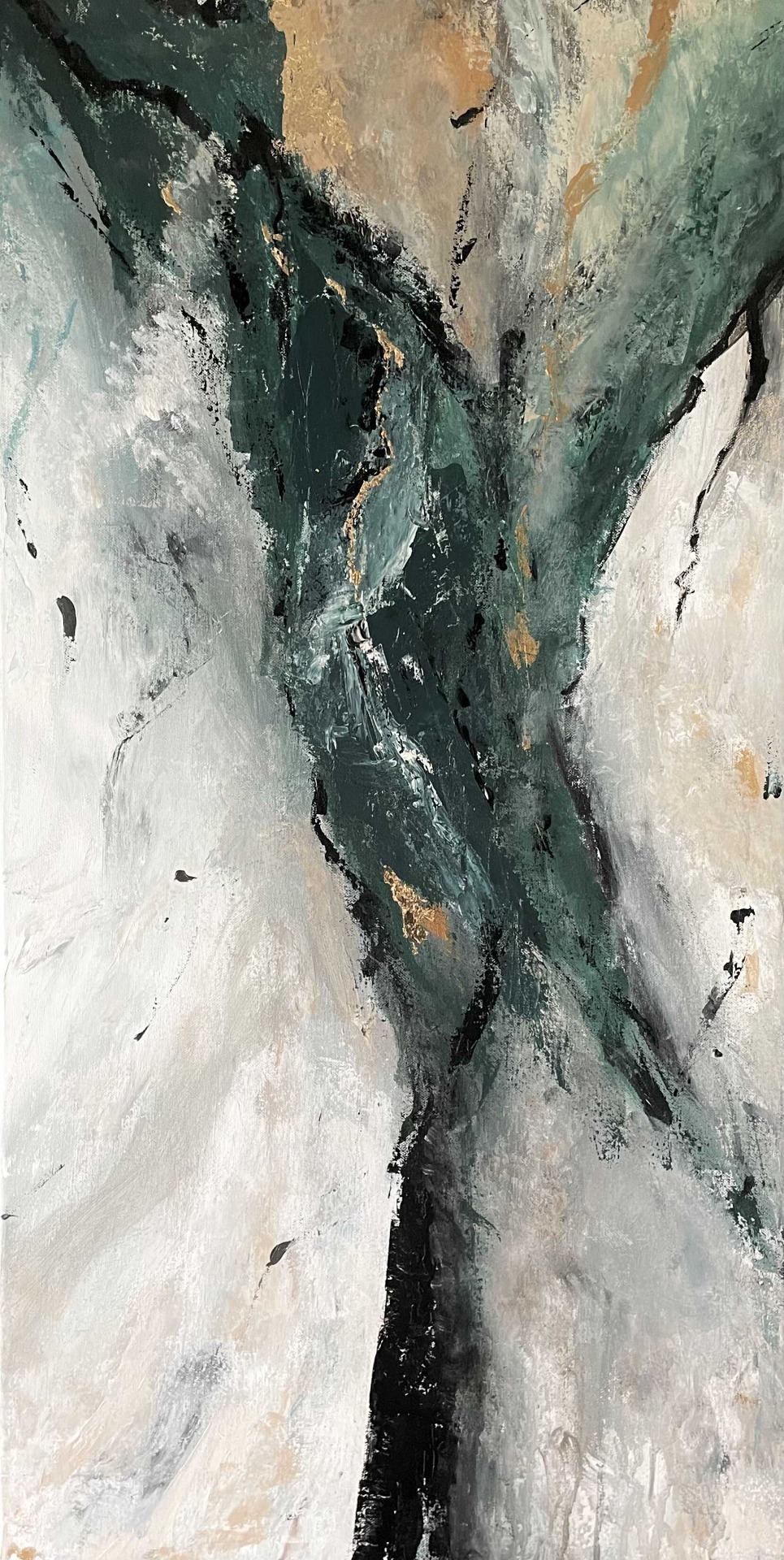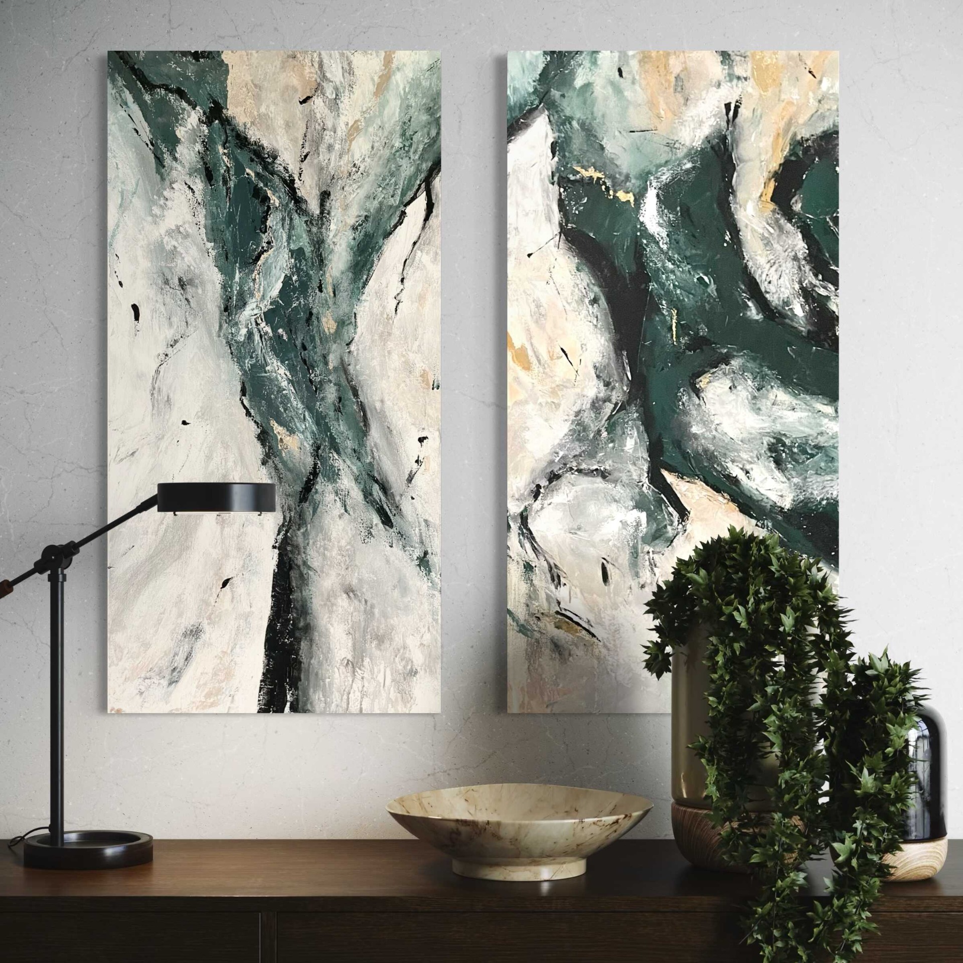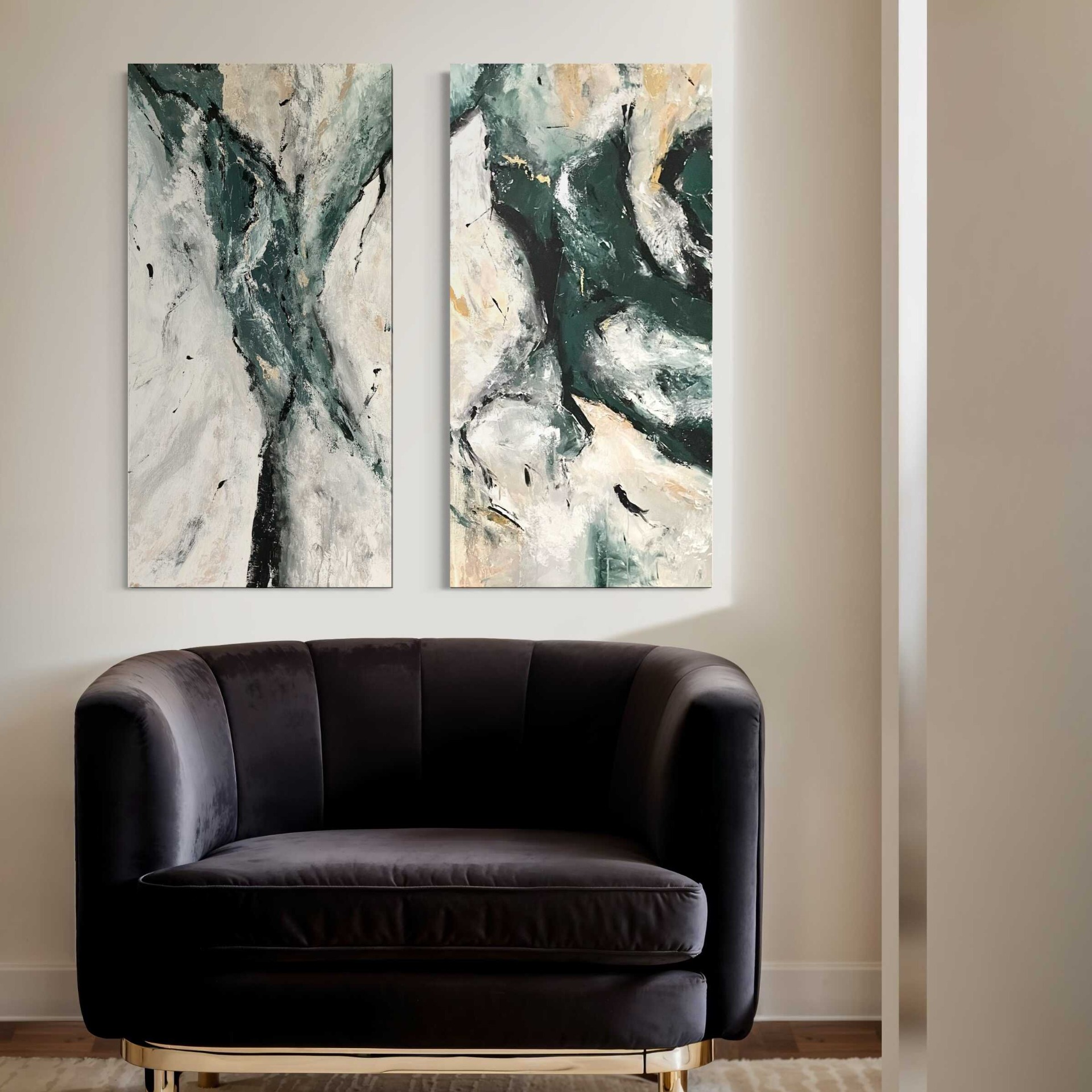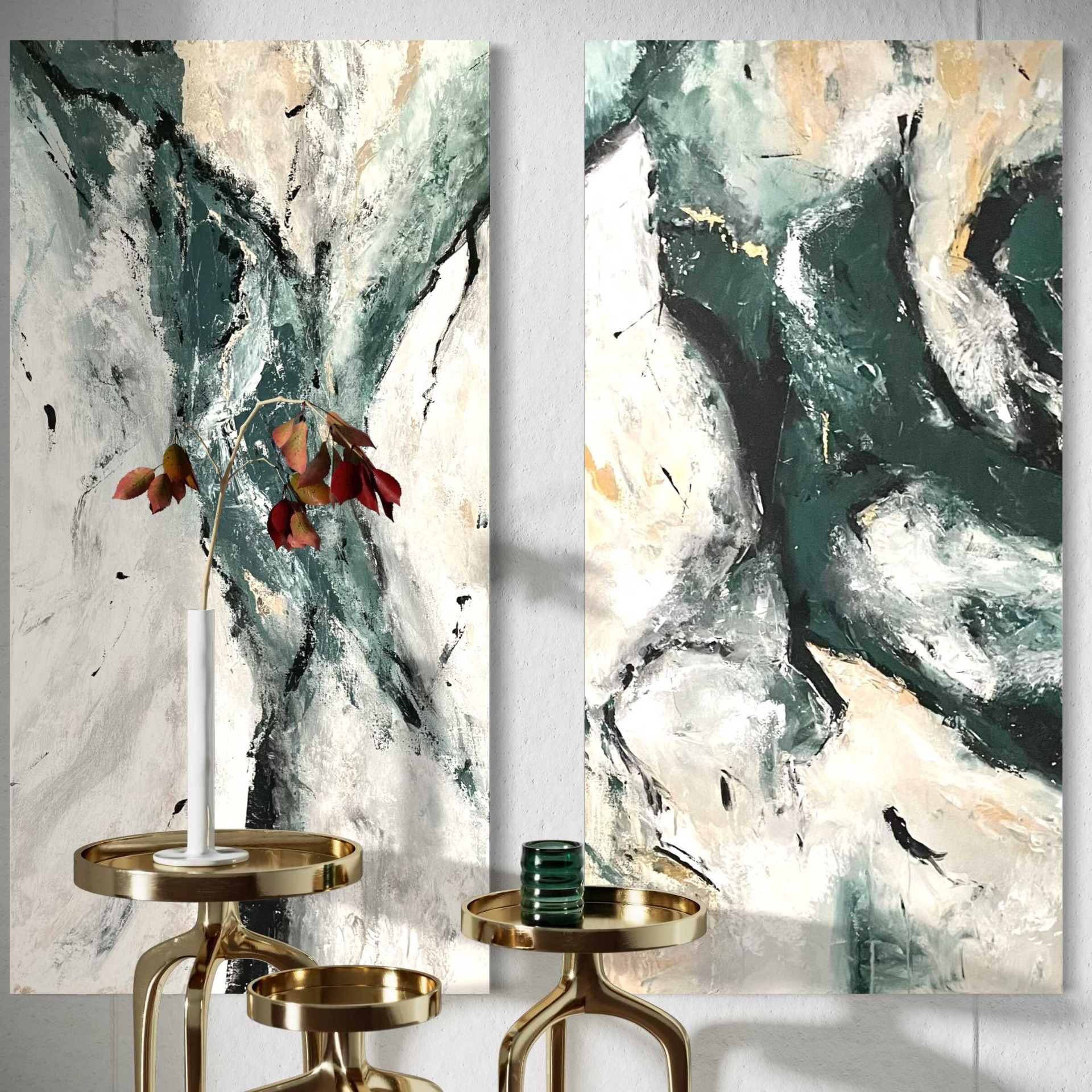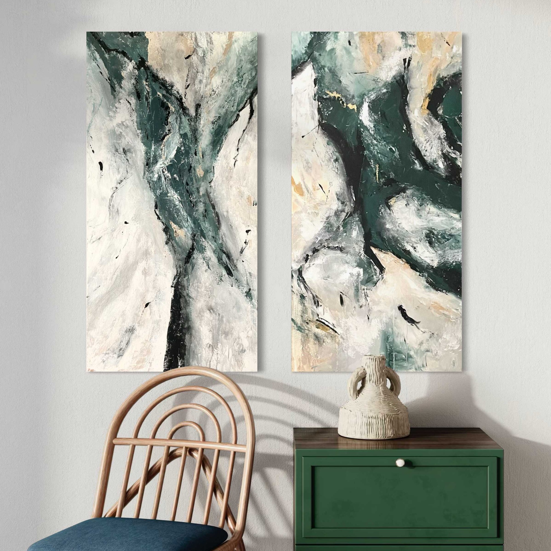A Smaragd című mű egy eredeti, kézzel festett modern absztrakt festménypár. A zöld, fehér, bézs és finom arany árnyalatok harmonikusan illeszkednek elegáns, modern és minimalista enteriőrökhöz.