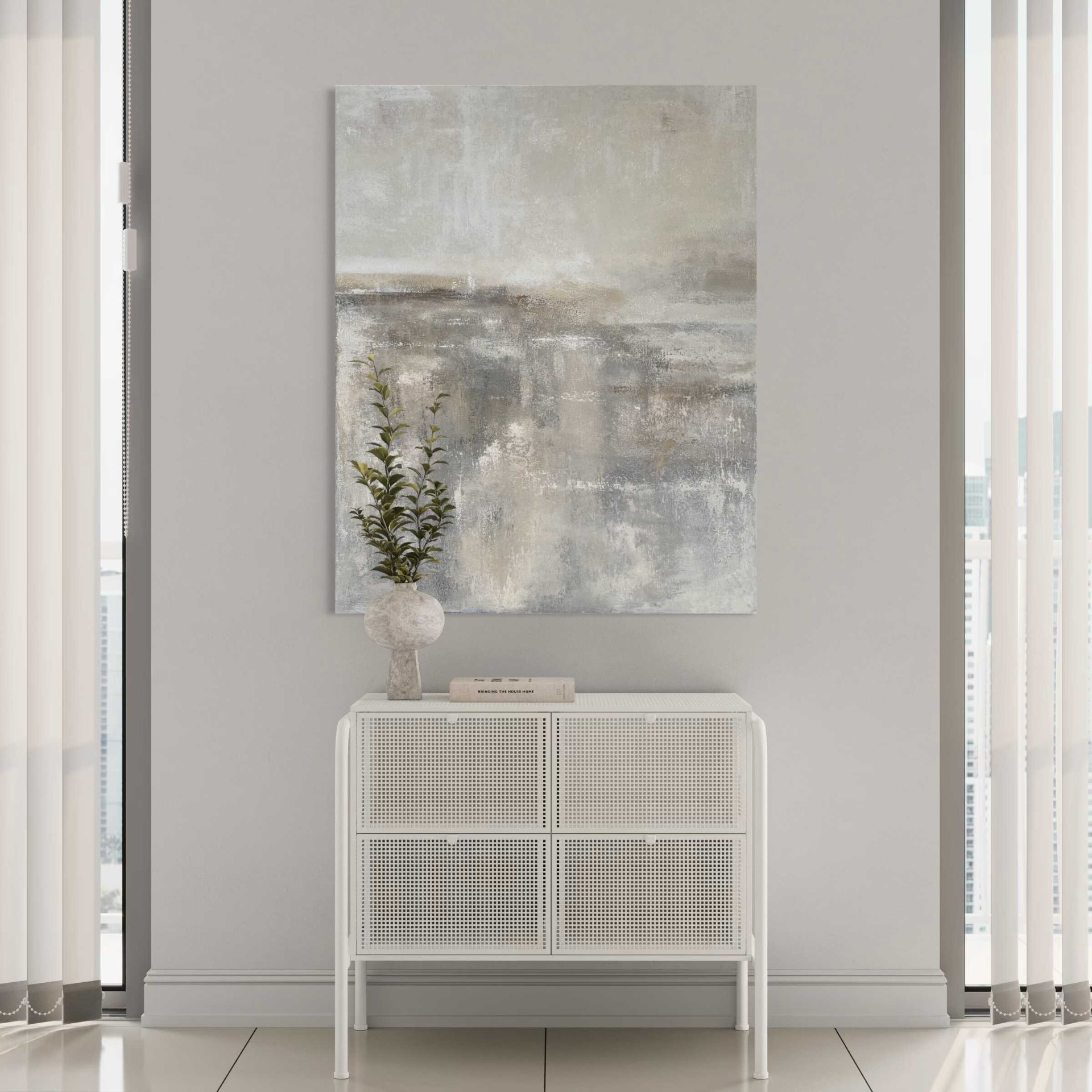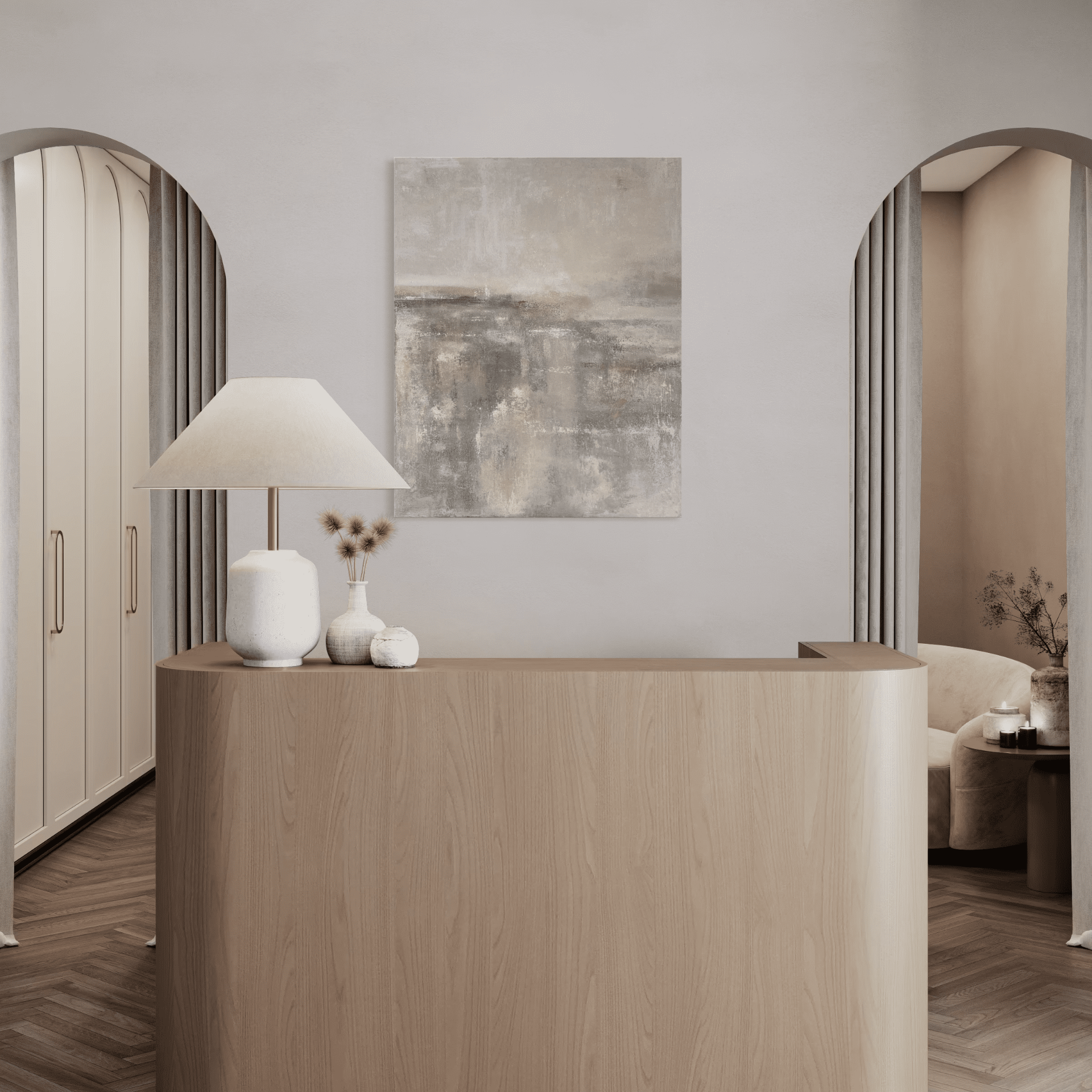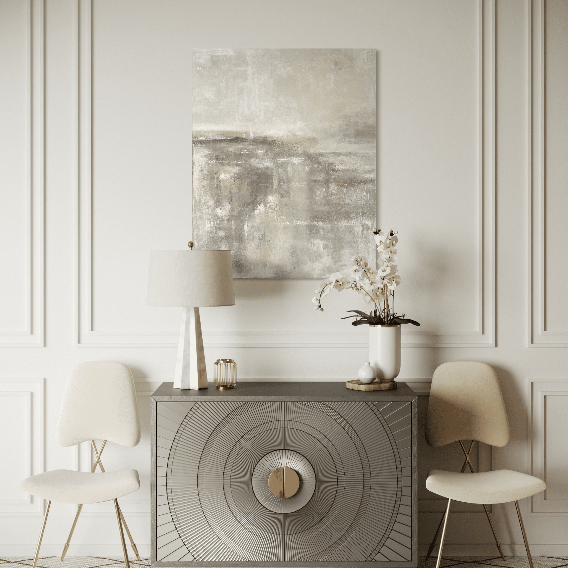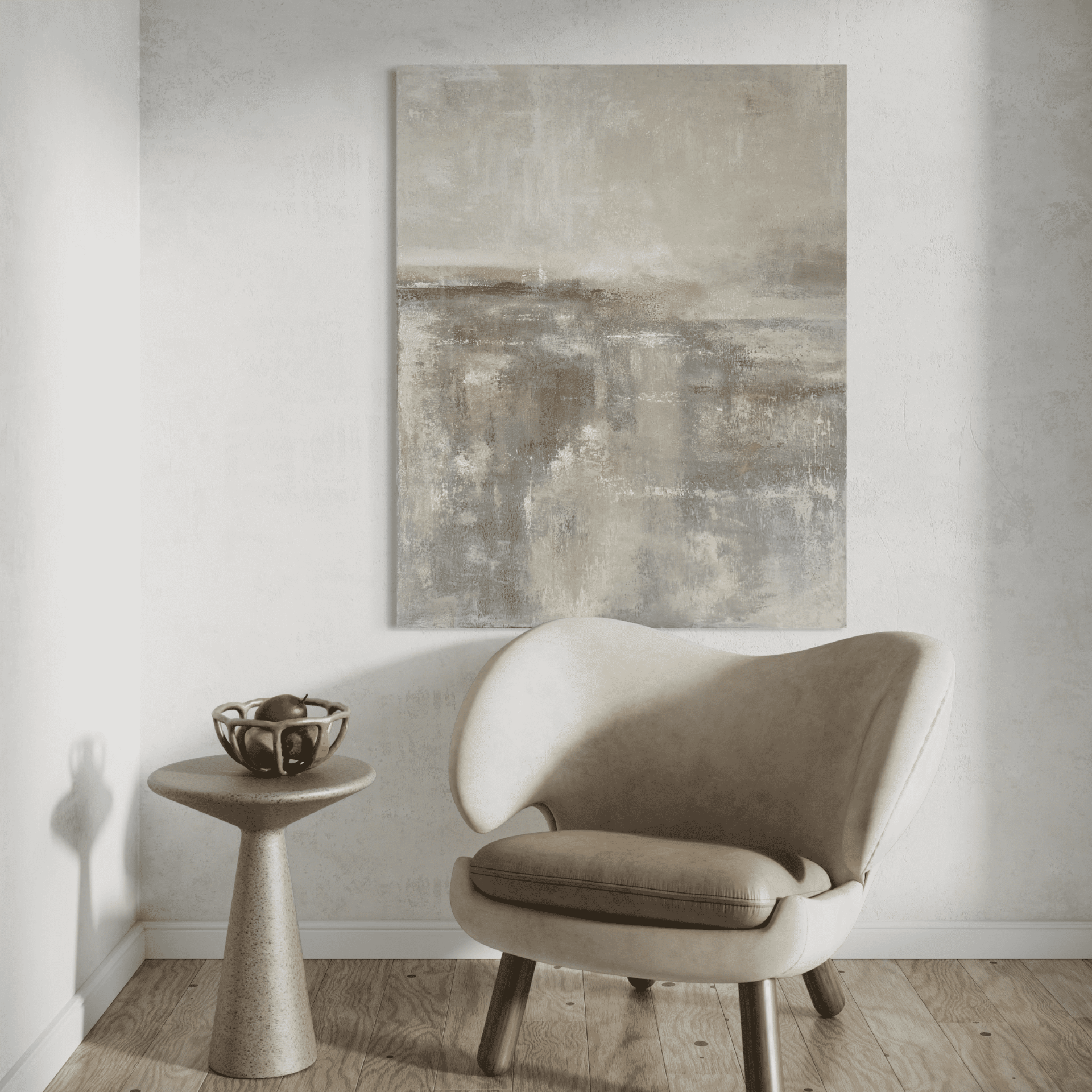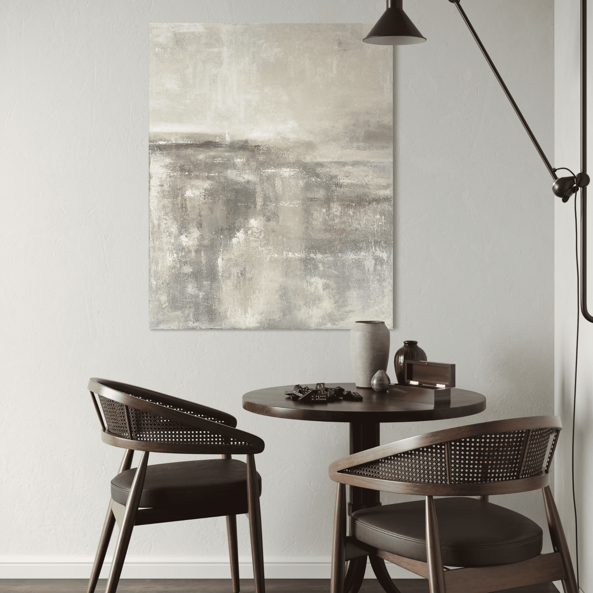 A bézs, szürke és törtfehér árnyalatok harmonikus együttese elegáns, letisztult megjelenést ad a festménynek, amely könnyedén illeszkedik modern enteriőrökbe.