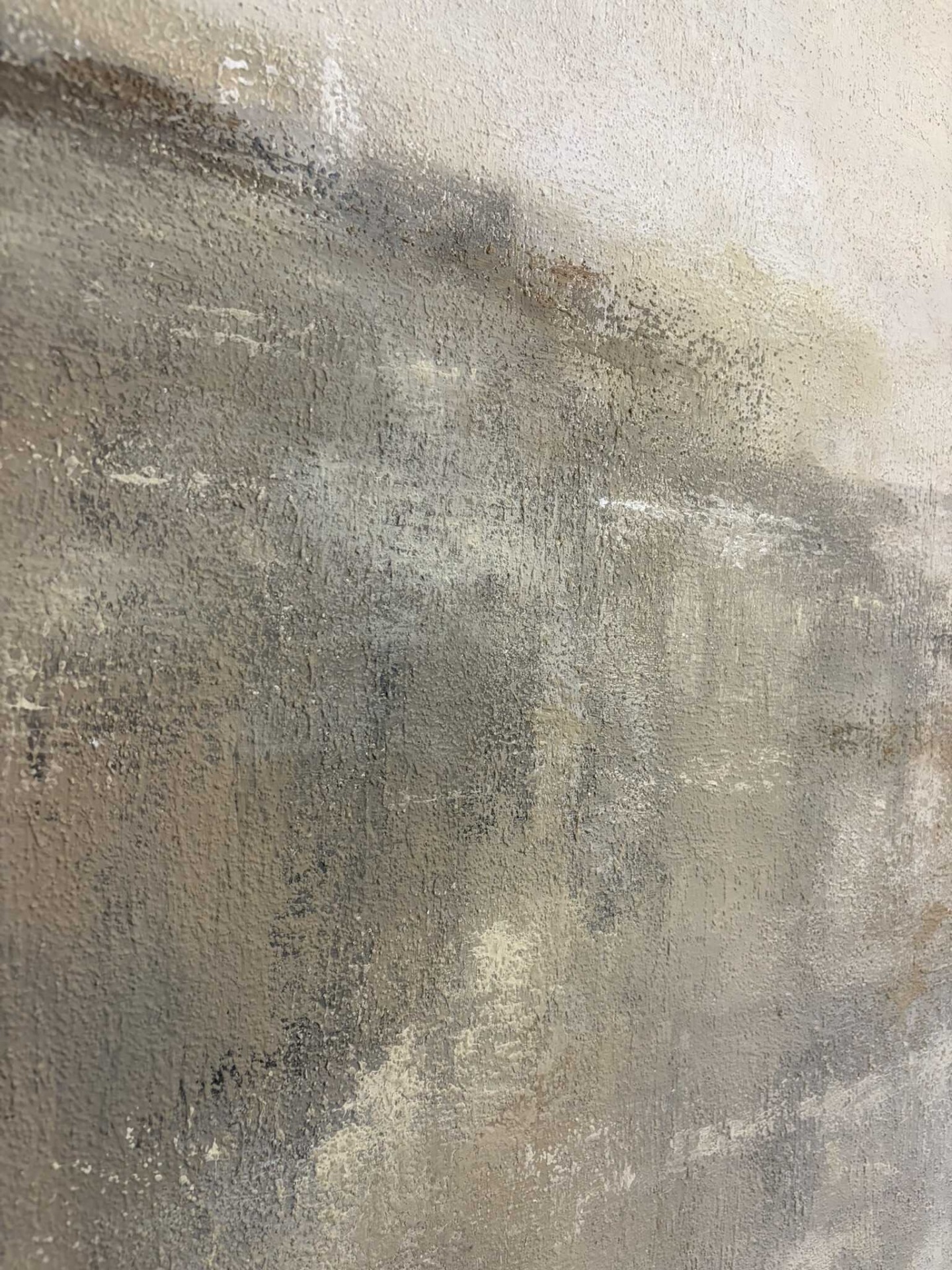 A textúra finoman jelenik meg a felületen, visszafogottan követve a táj jellegű kompozíciót, így a festmény közelről és távolról is gazdag részleteket mutat.