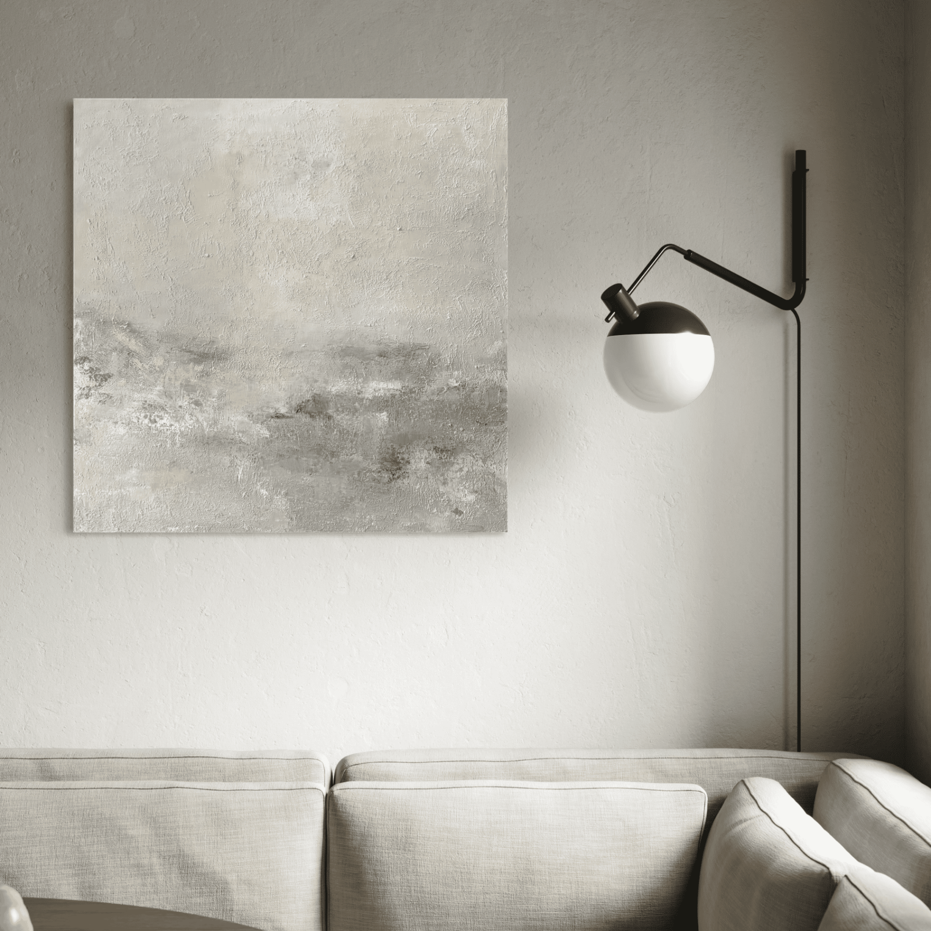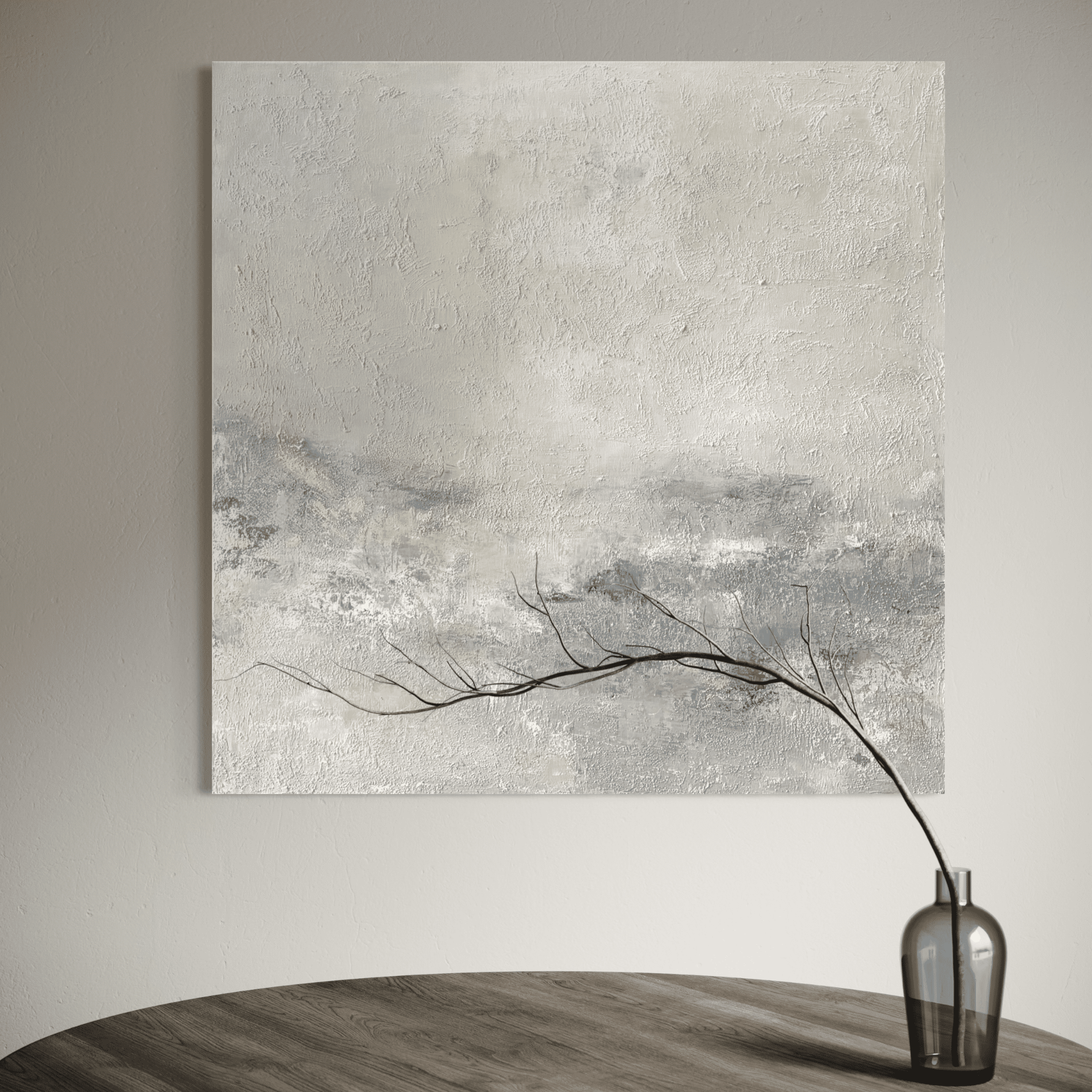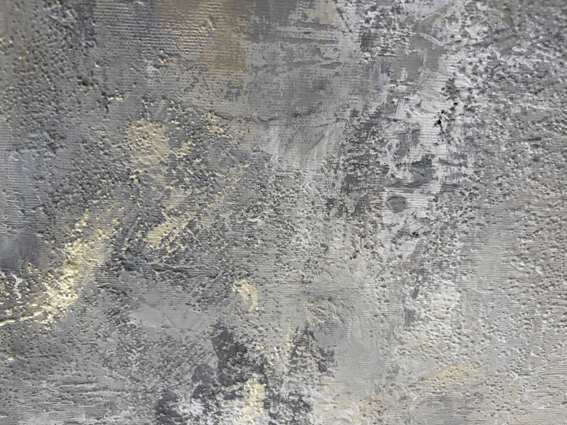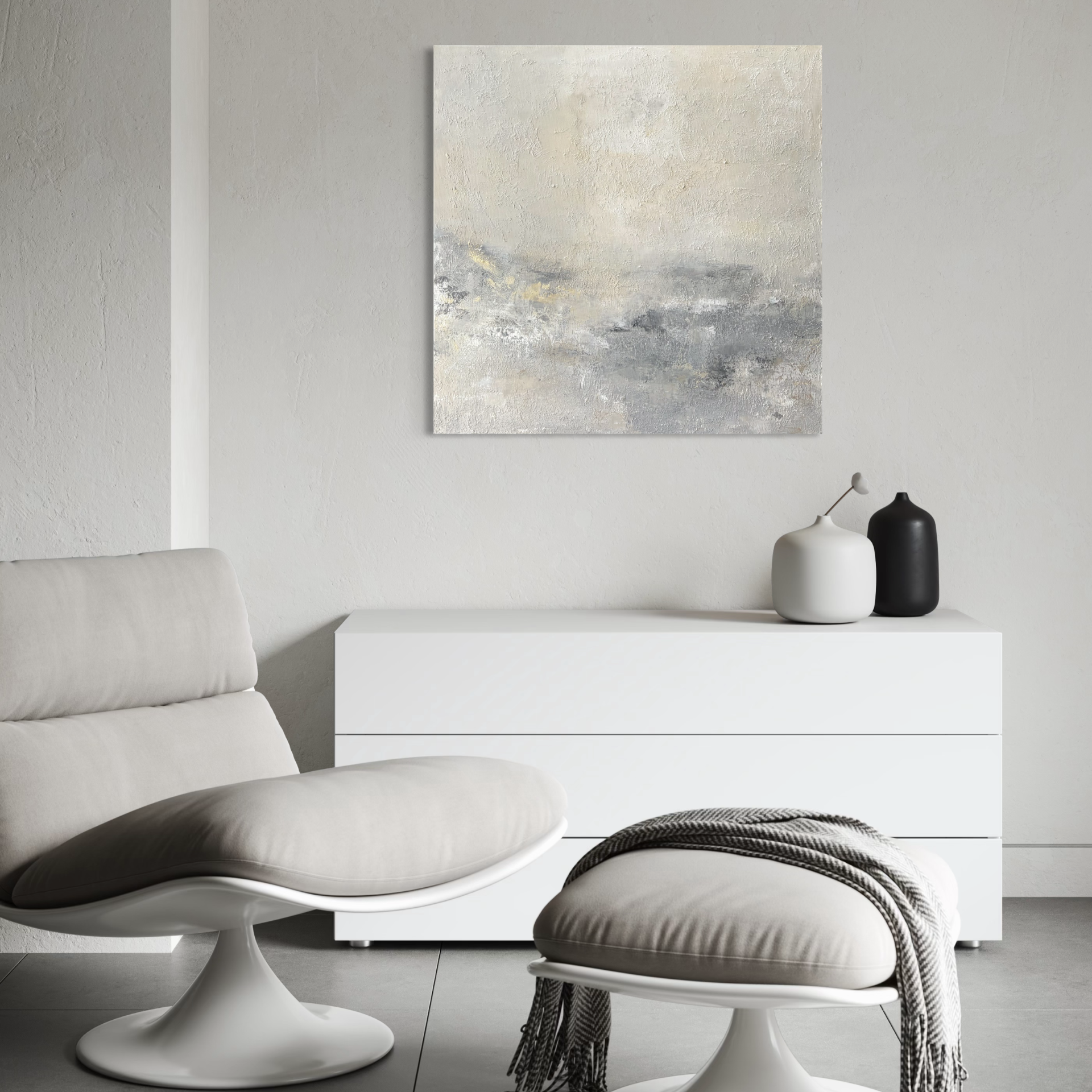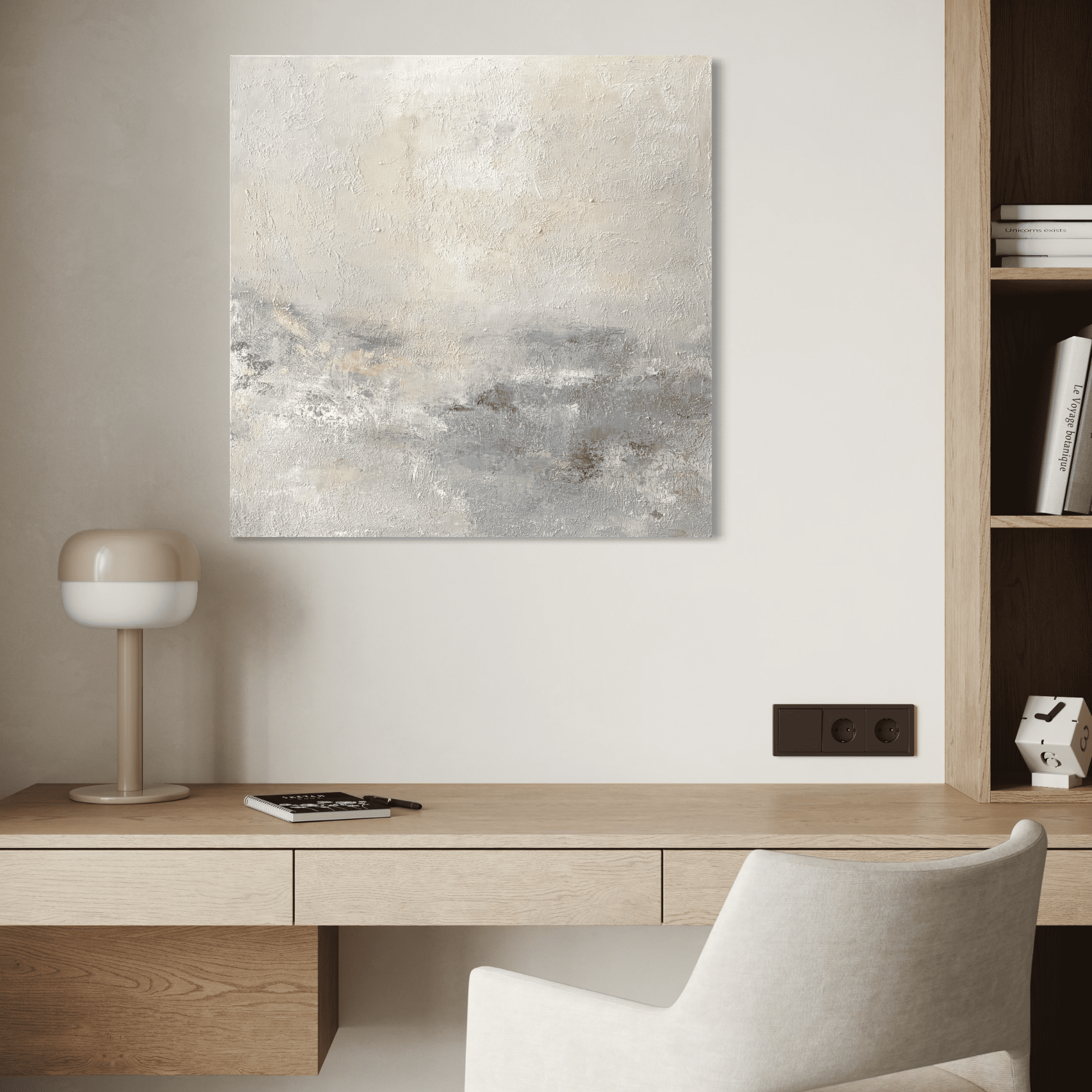 A Pearl egy finoman rétegzett, elegáns absztrakt festmény, amely a természetes felületek és a gyöngyházfény visszafogott szépségét idézi meg. A világos bézs, törtfehér és szürke árnyalatok harmonikusan olvadnak egymásba, miközben a felület textúrája finom mélységet ad a kompozíciónak.