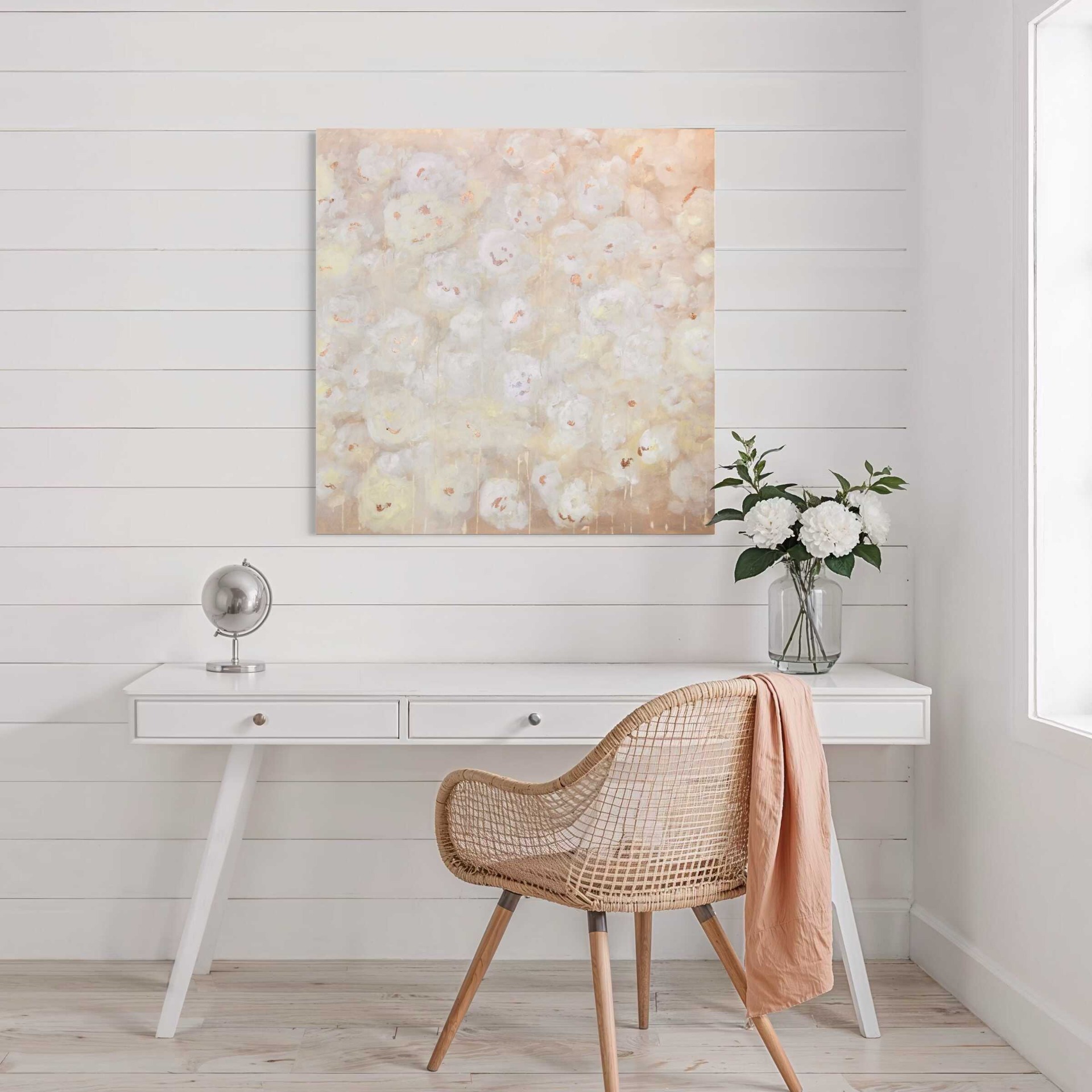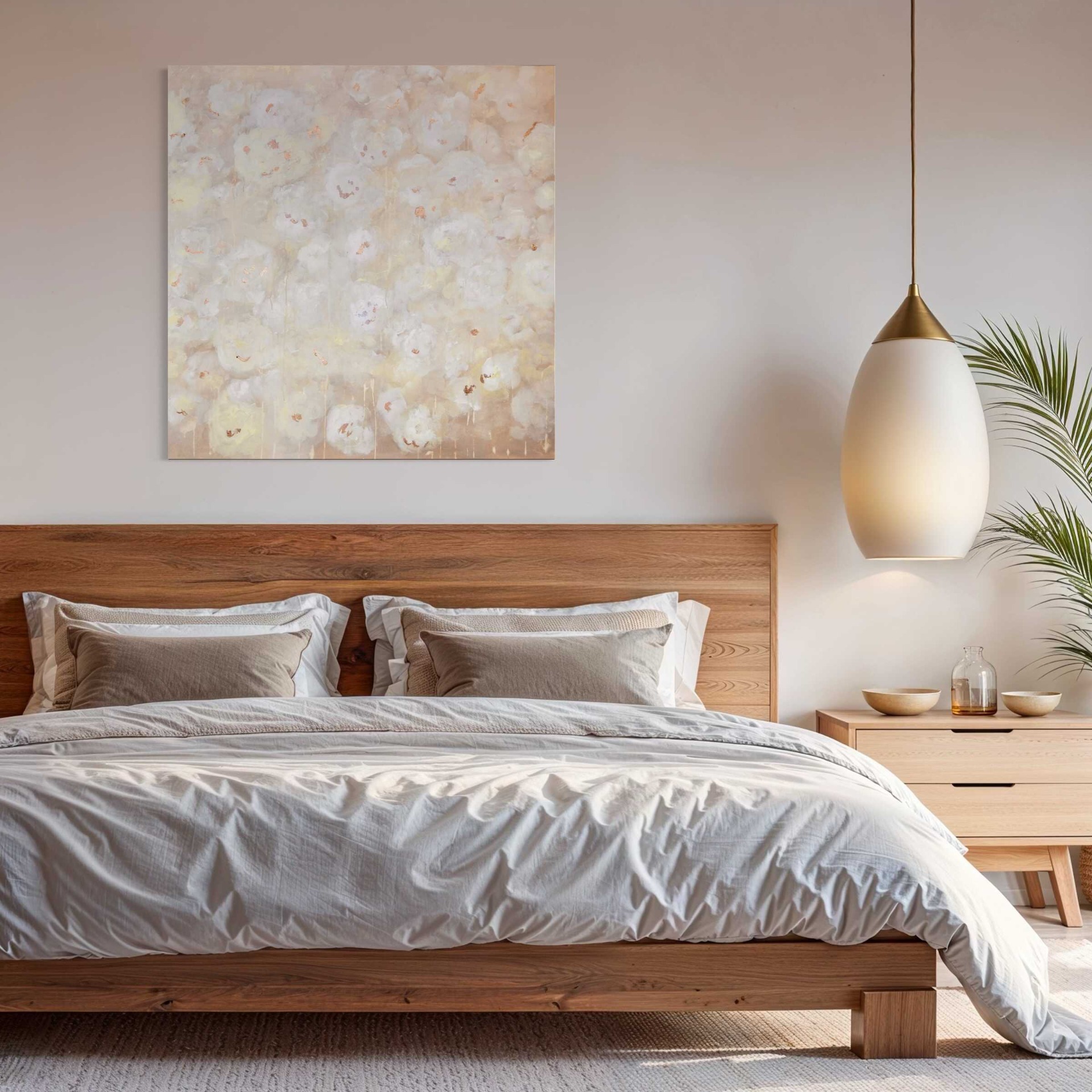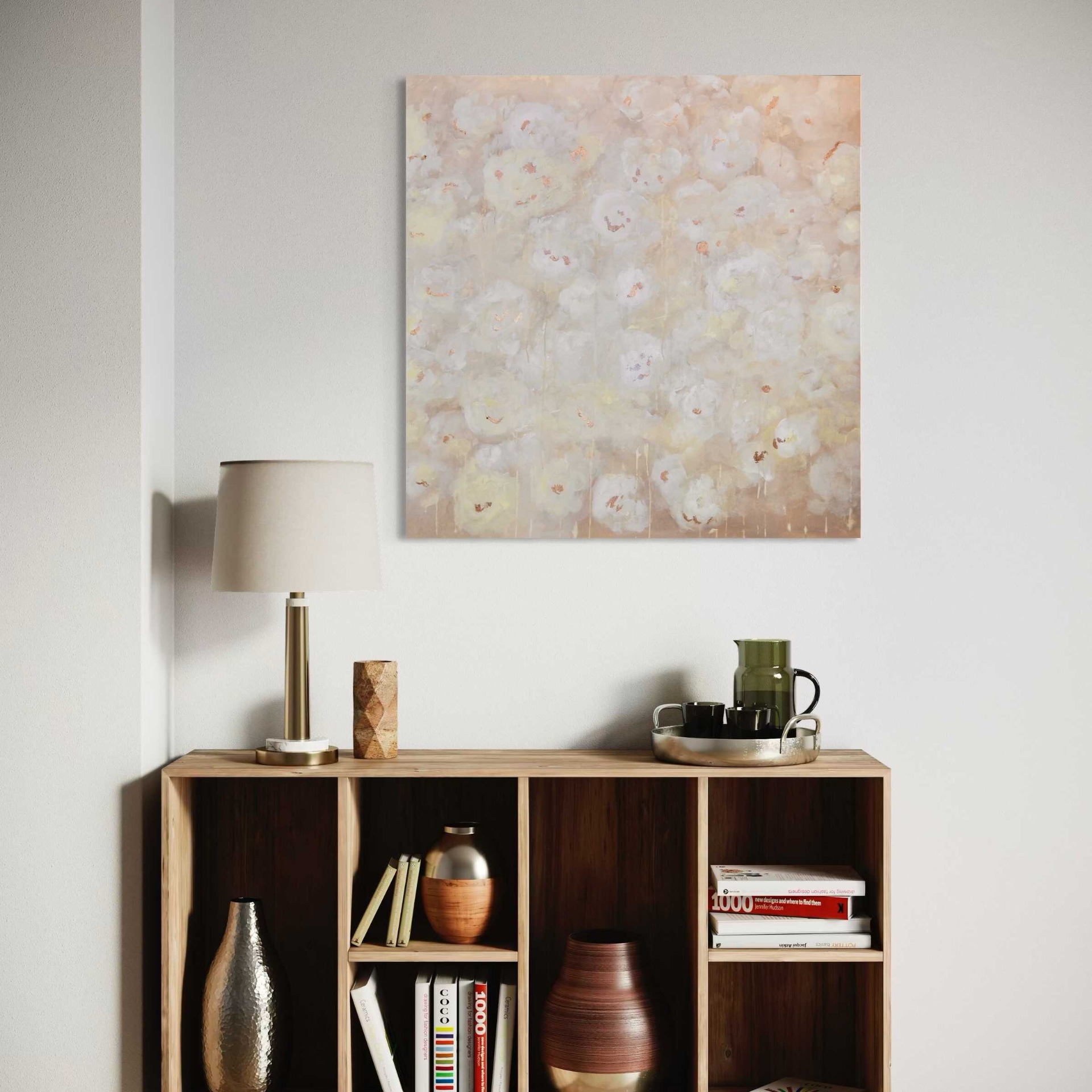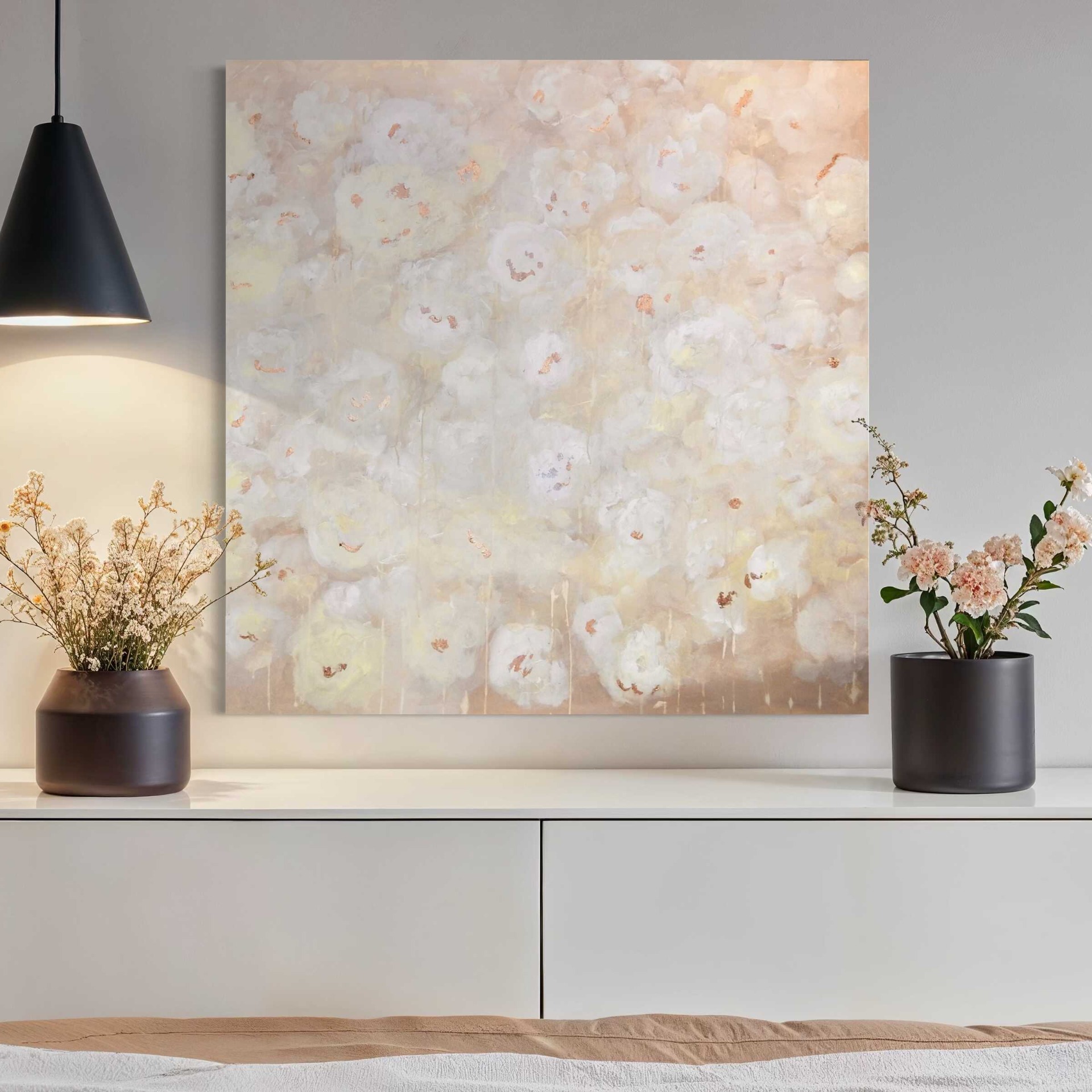 A "Púder" egy finoman elegáns, visszafogott luxust sugárzó absztrakt festmény, amely lágy pasztell árnyalataival és selymes, texturált felületével teremt harmonikus, békés atmoszférát bármely enteriőrben. A púder, törtfehér és bézs tónusok légies keveredése nőies, romantikus hangulatot áraszt, míg a diszkrét arany részletek finom ragyogást visznek a kompozícióba.