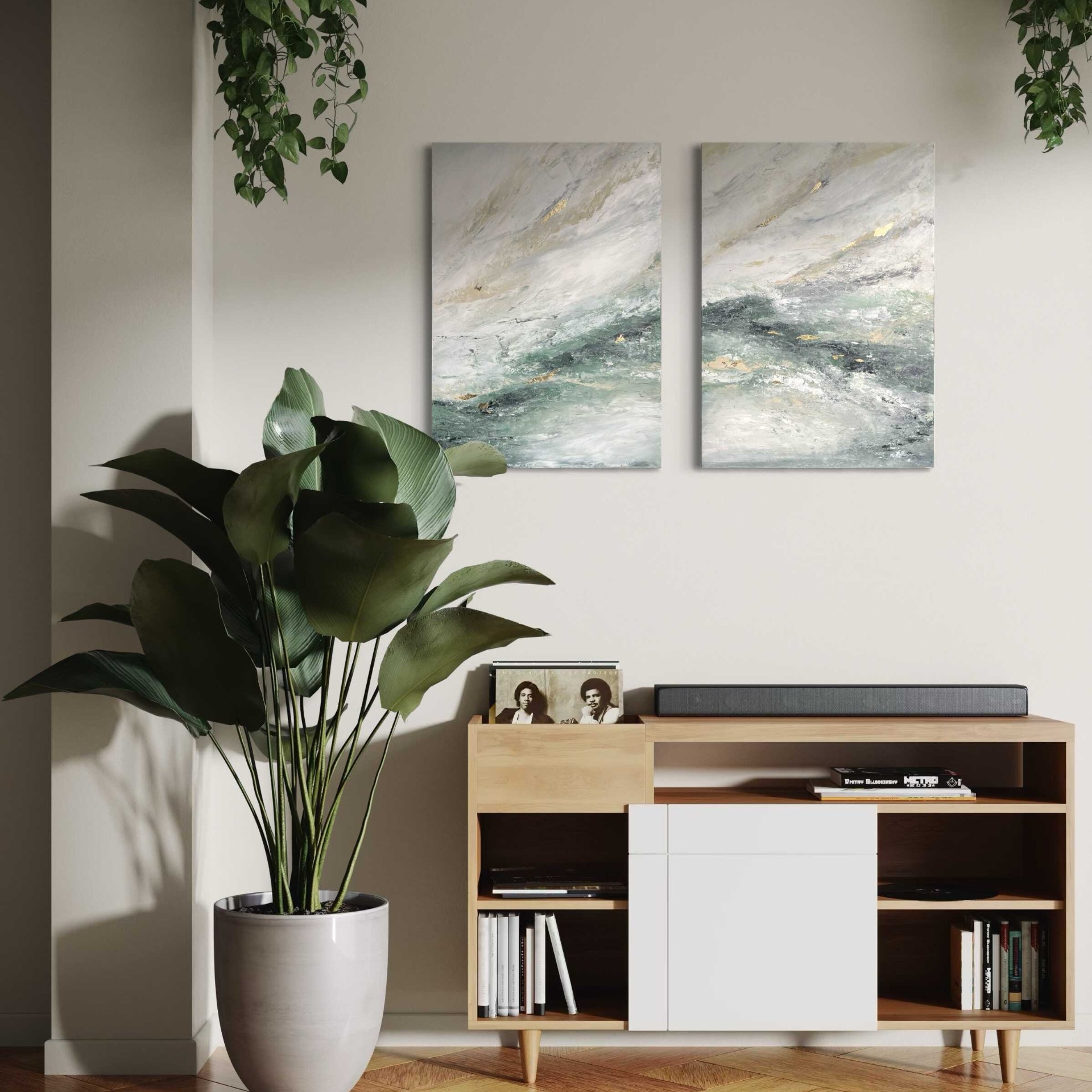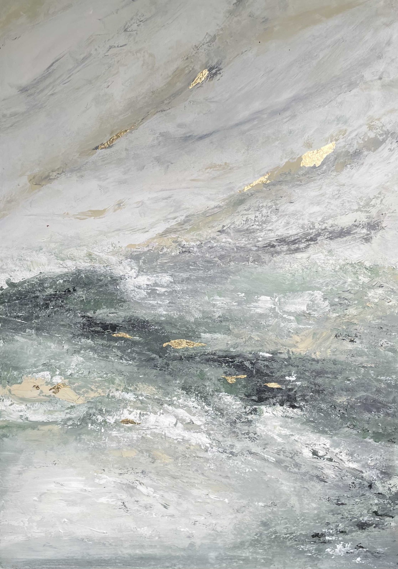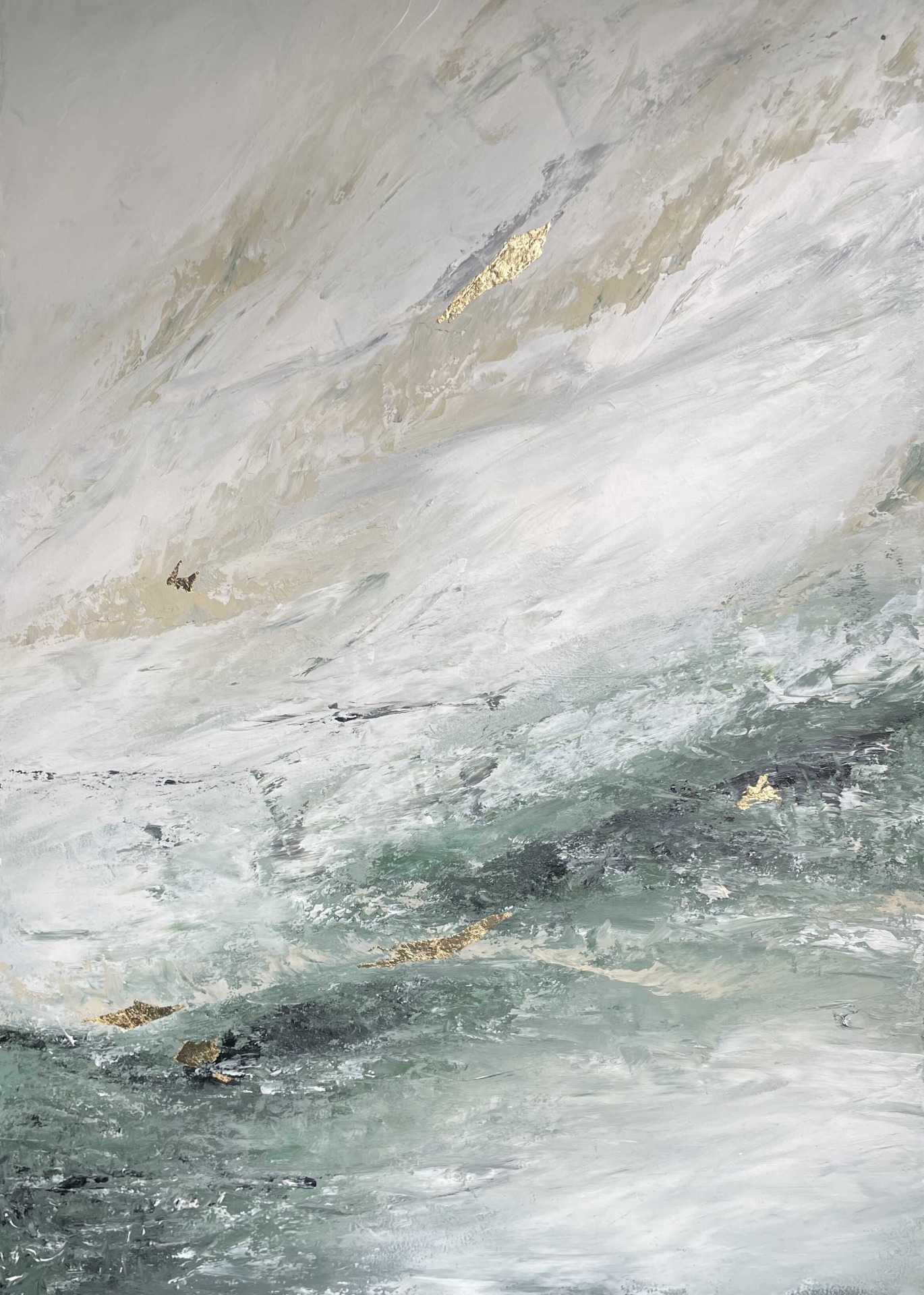 A "Sodrás" című mű egy eredeti, kézzel festett absztrakt festmény. A zöld, fehér és arany árnyalatok harmonikusan illeszkednek modern és minimalista enteriőrökhöz.