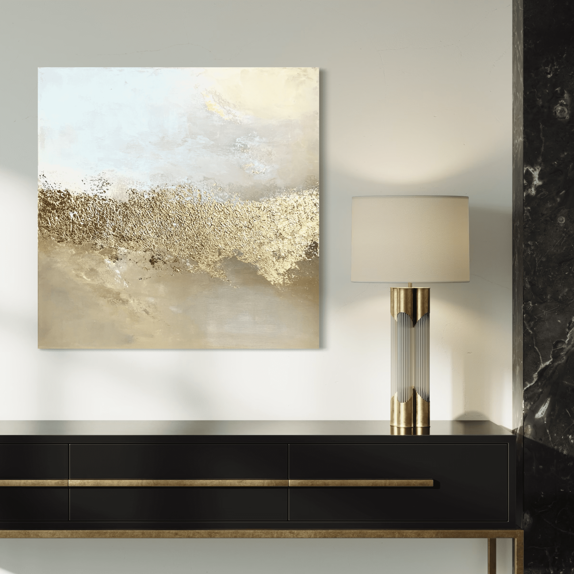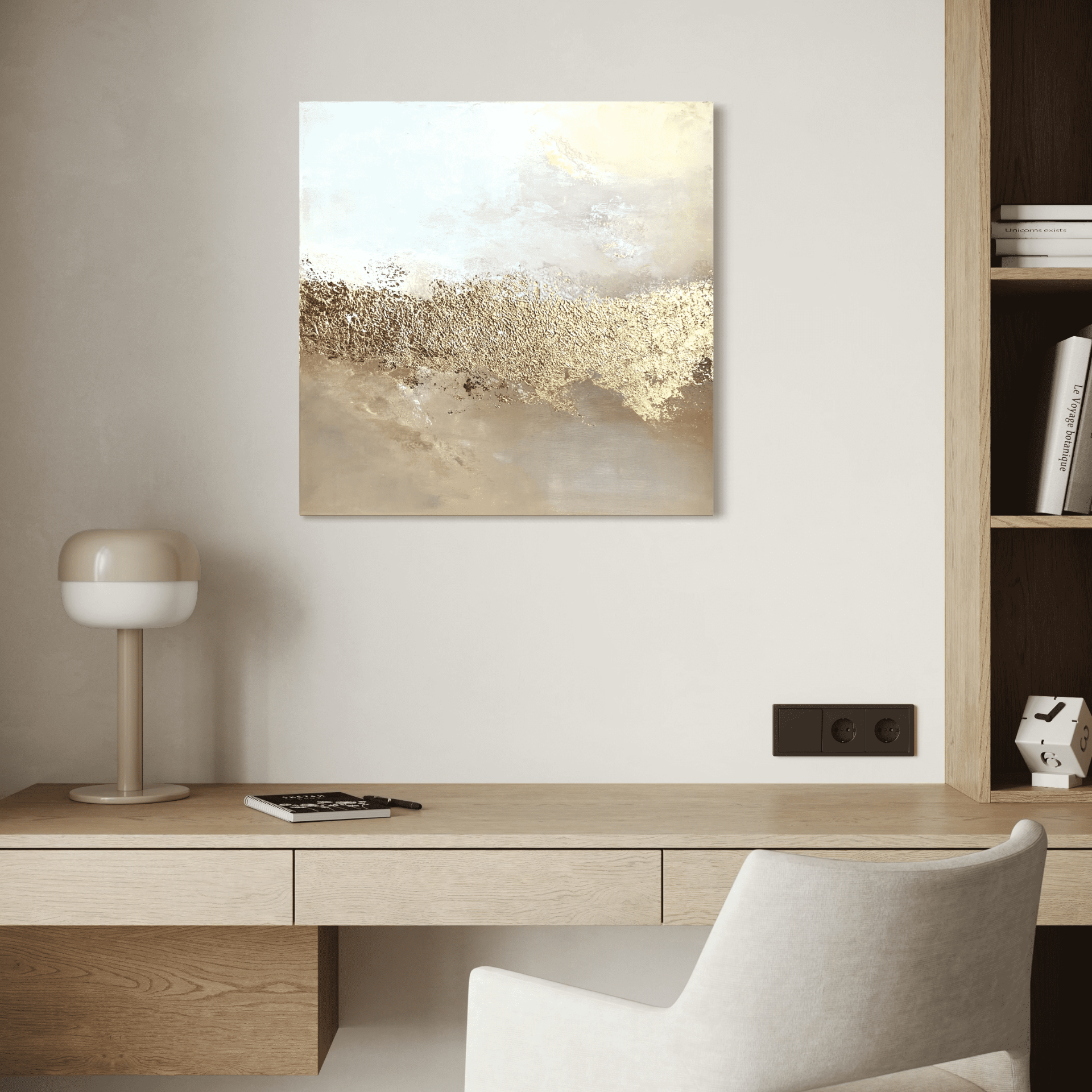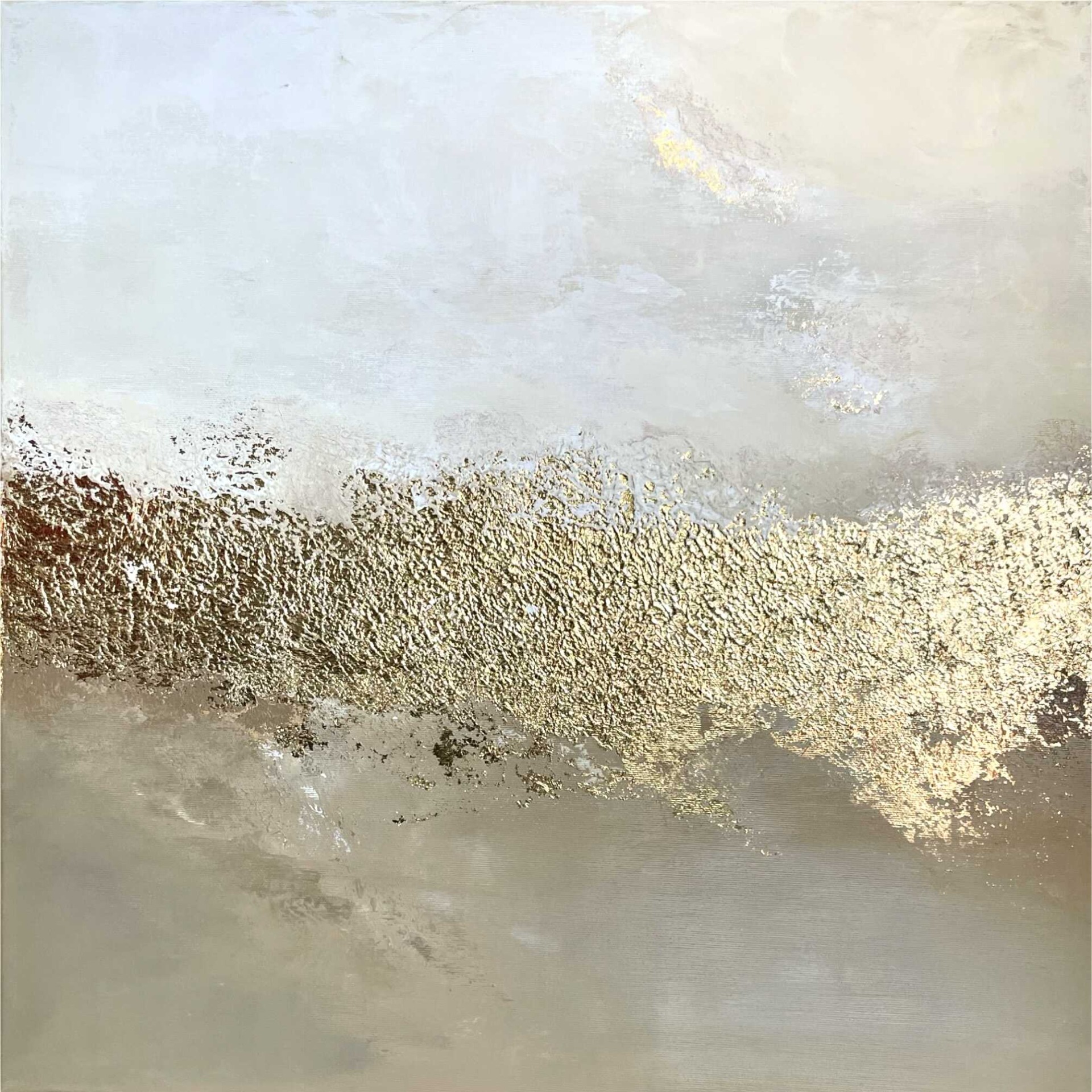 A Strata a Golden Horizon sorozat egyik letisztult, elegáns darabja. A horizontálisan futó, texturált arany sáv rétegződést, mélységet és időtlen nyugalmat sugall. A bézs, törtfehér és finoman kevert földszínek harmonikus hátteret adnak az arany fólia természetes ragyogásának.