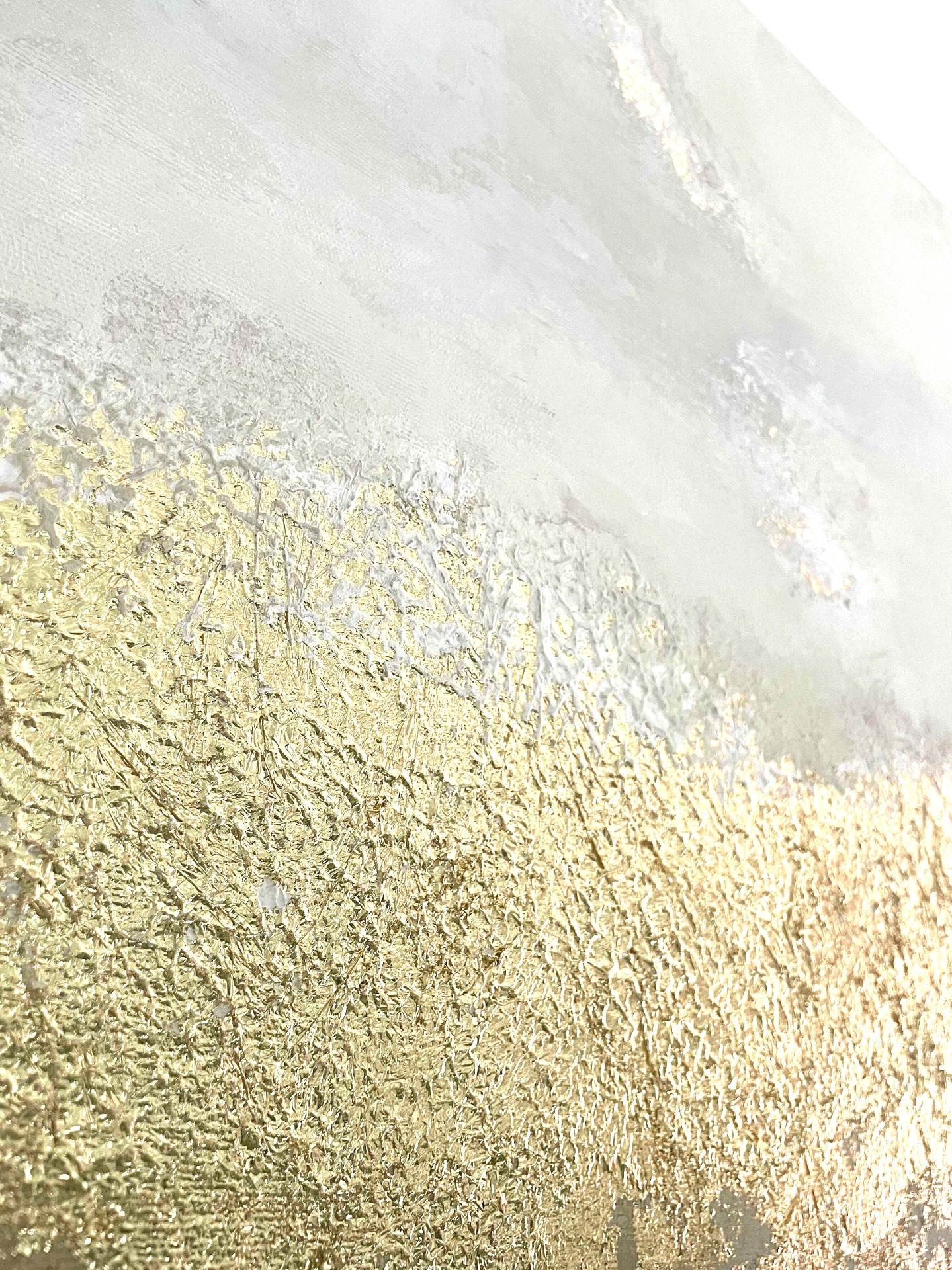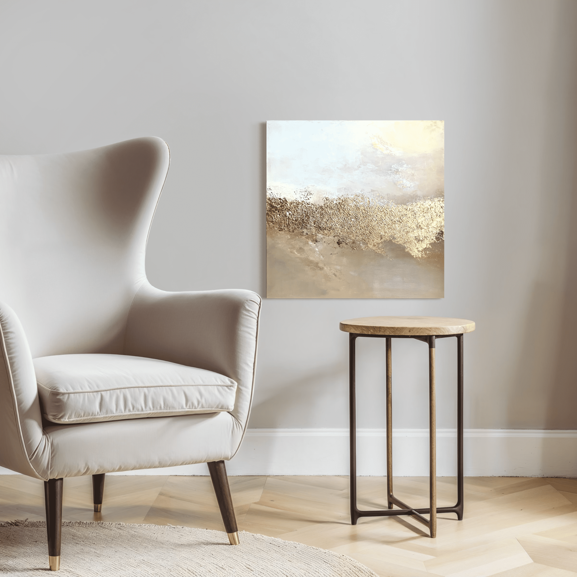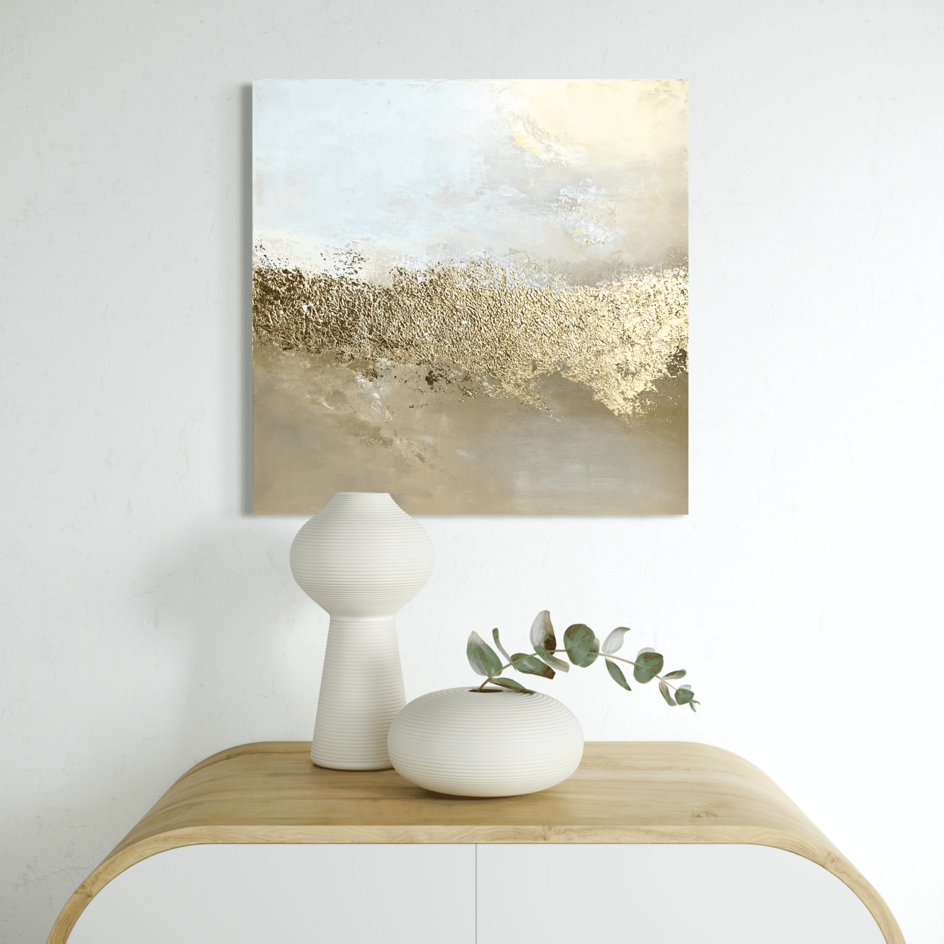 A Strata a Golden Horizon sorozat egyik letisztult, elegáns darabja. A horizontálisan futó, texturált arany sáv rétegződést, mélységet és időtlen nyugalmat sugall. A bézs, törtfehér és finoman kevert földszínek harmonikus hátteret adnak az arany fólia természetes ragyogásának.