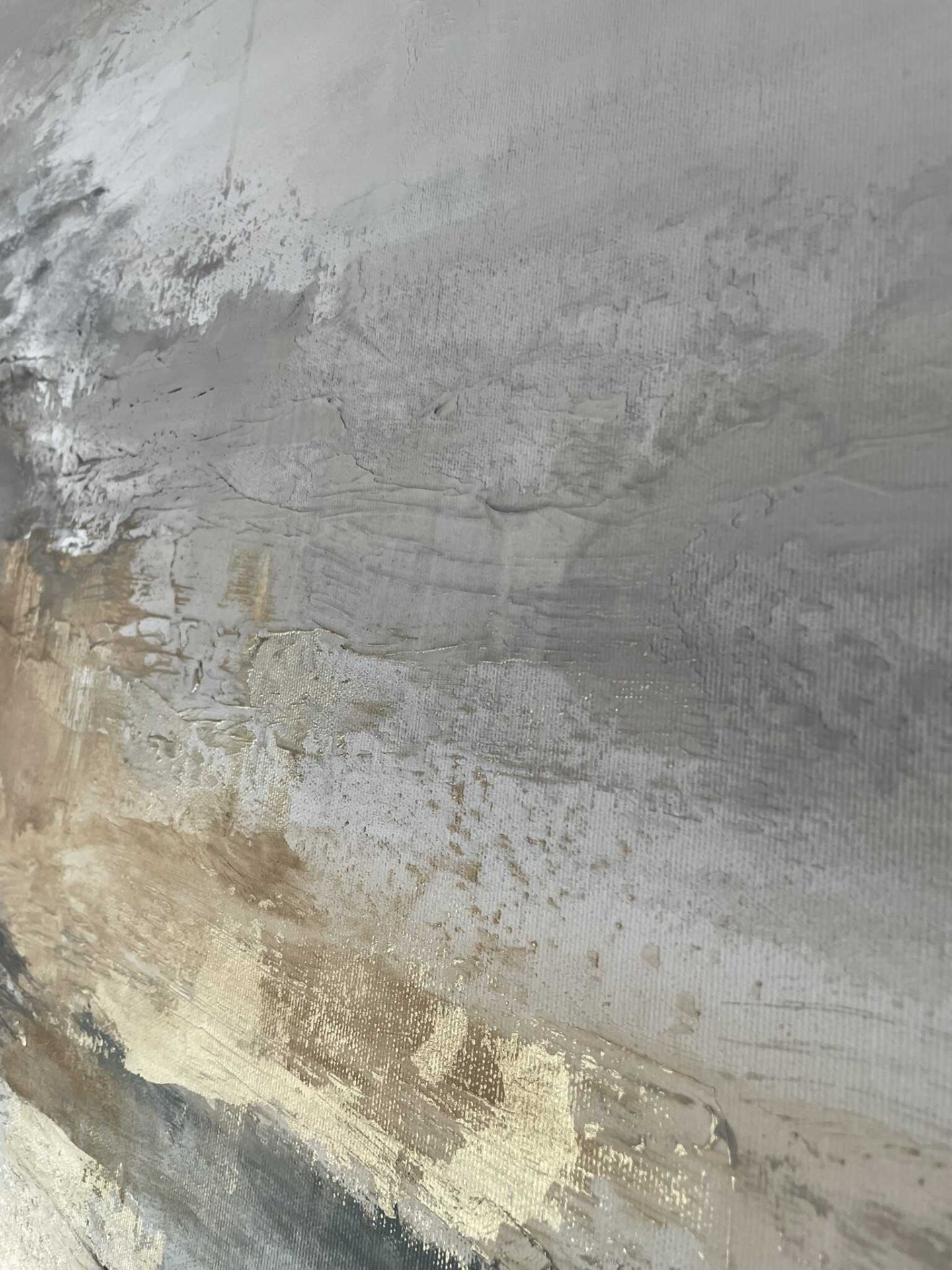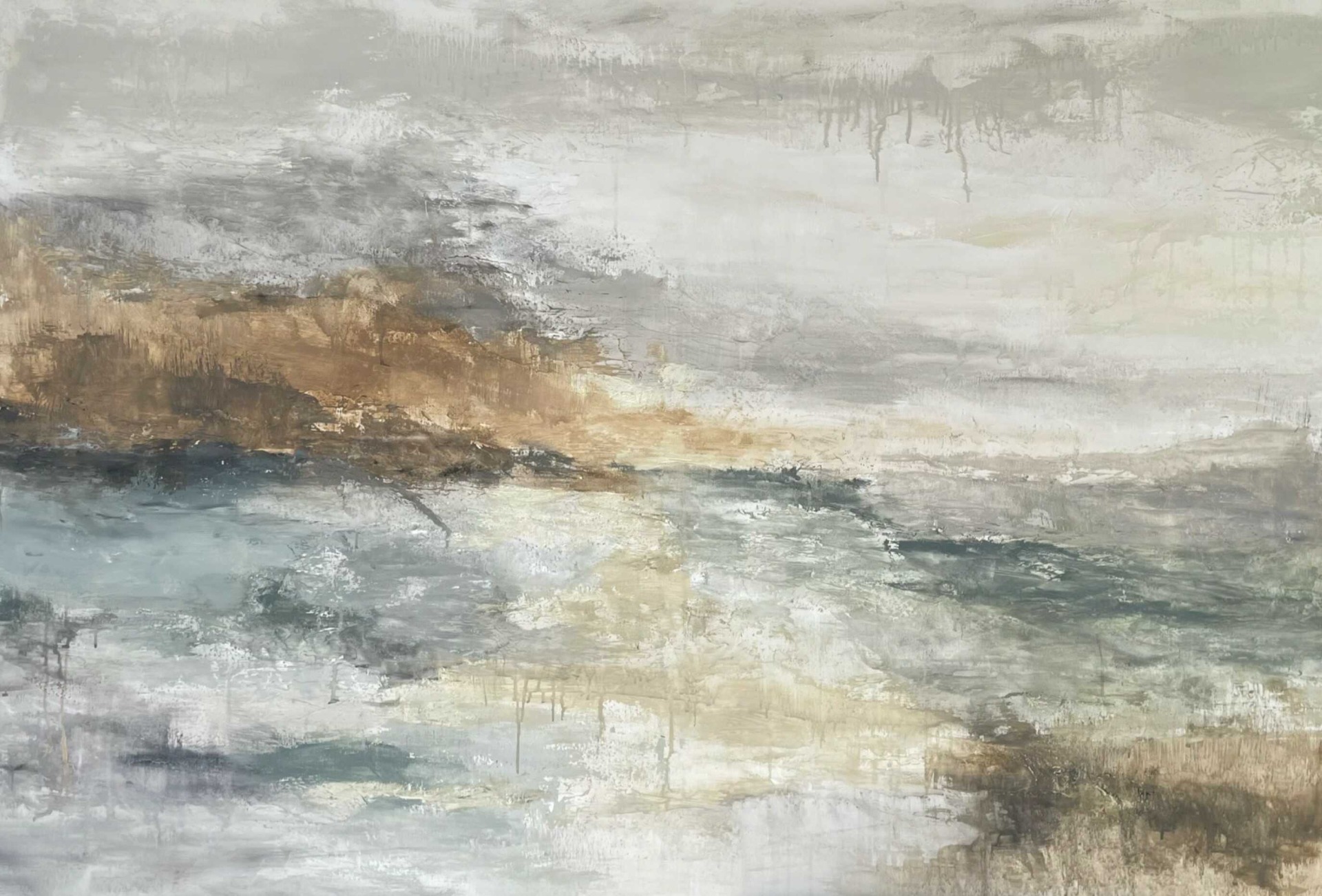 A Távol egy nagyméretű, texturált absztrakt festmény, amely finom földszínekből és hidegebb zöldes árnyalatokból építkezik. A kép központi eleme a horizontális arany sáv, amely fényt és mélységet ad a kompozíciónak.