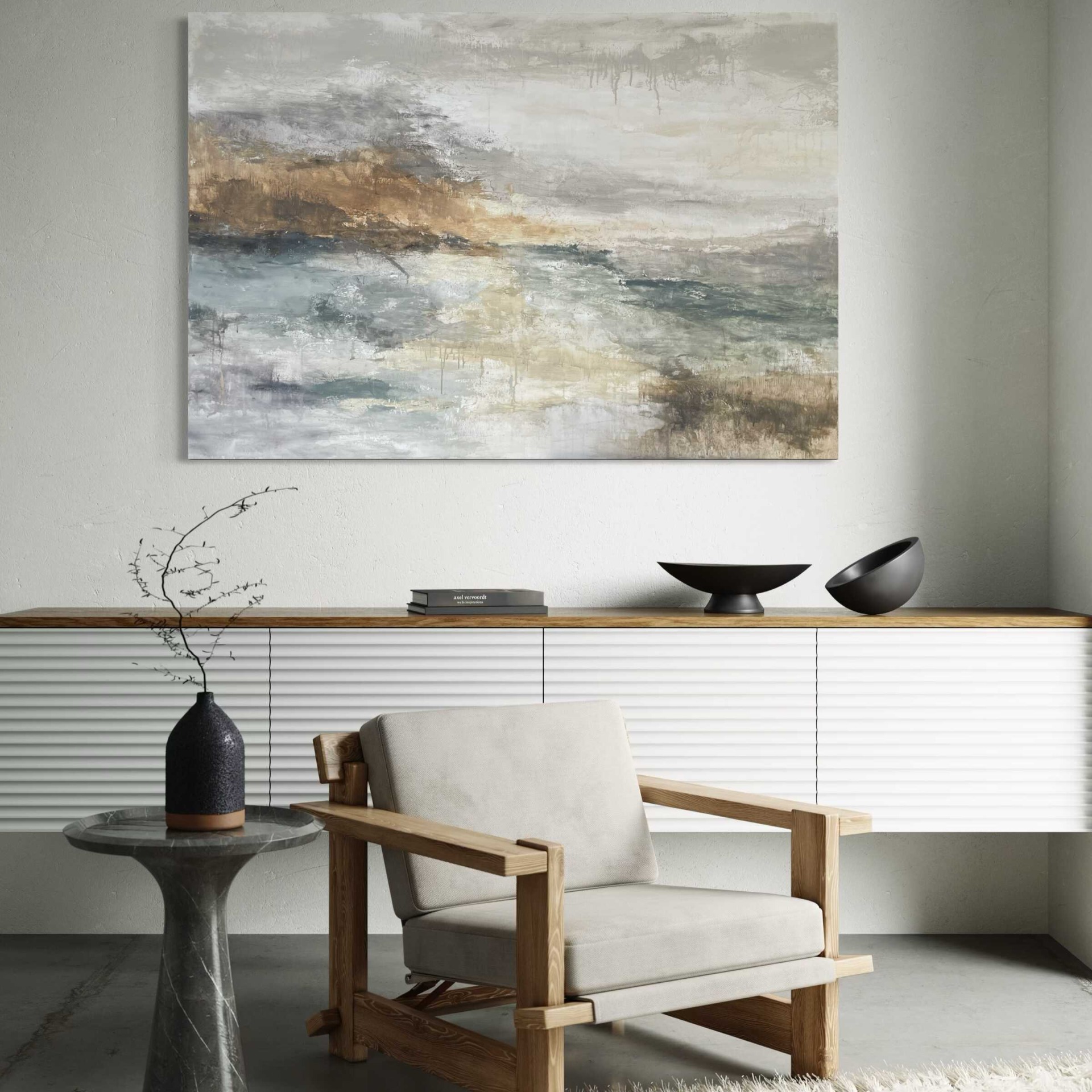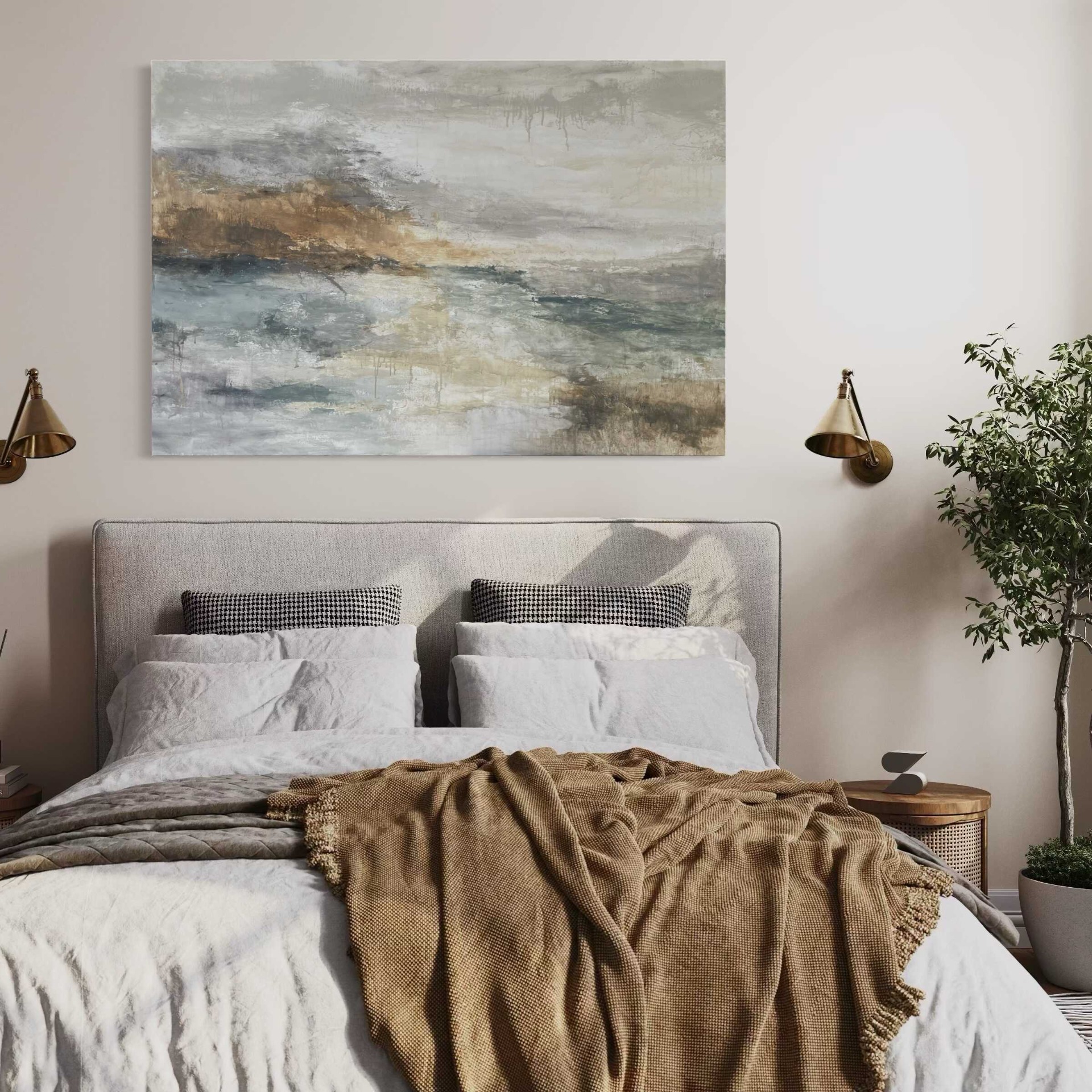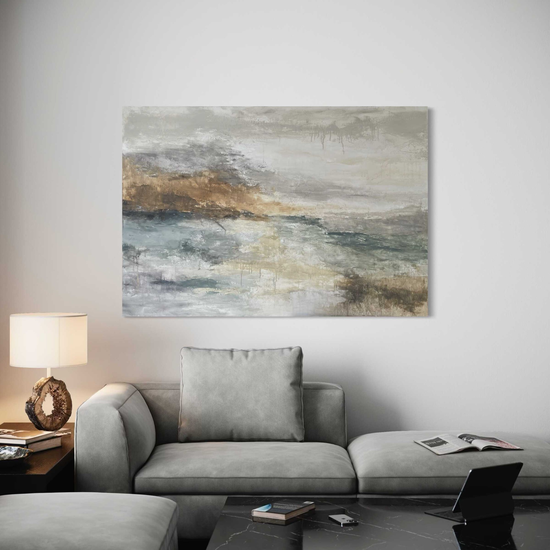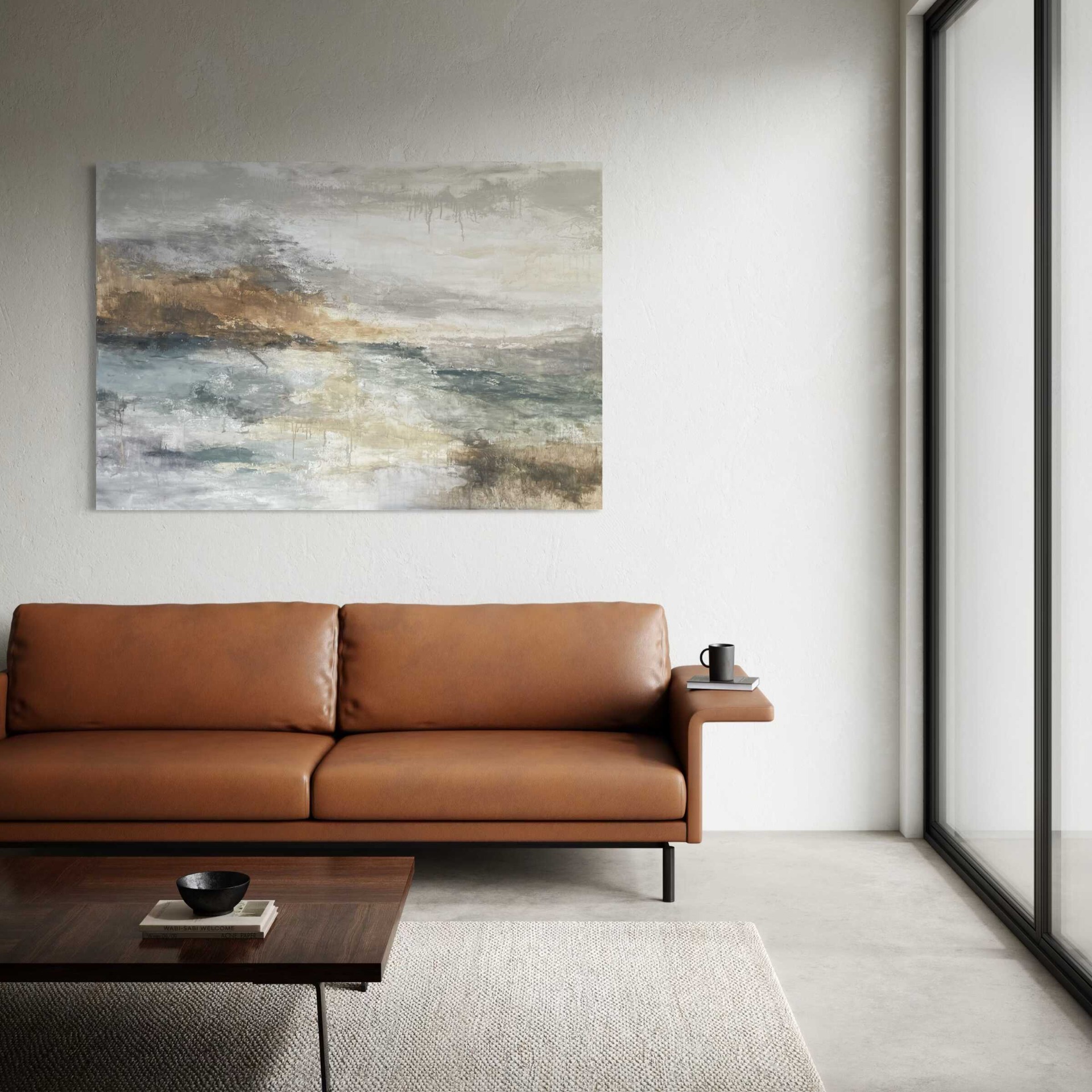 Ez az alkotás különösen jól működik nagyobb falakon, ahol a festmény lélegző teret kap, és az enteriőr természetes fókuszpontjává válik.