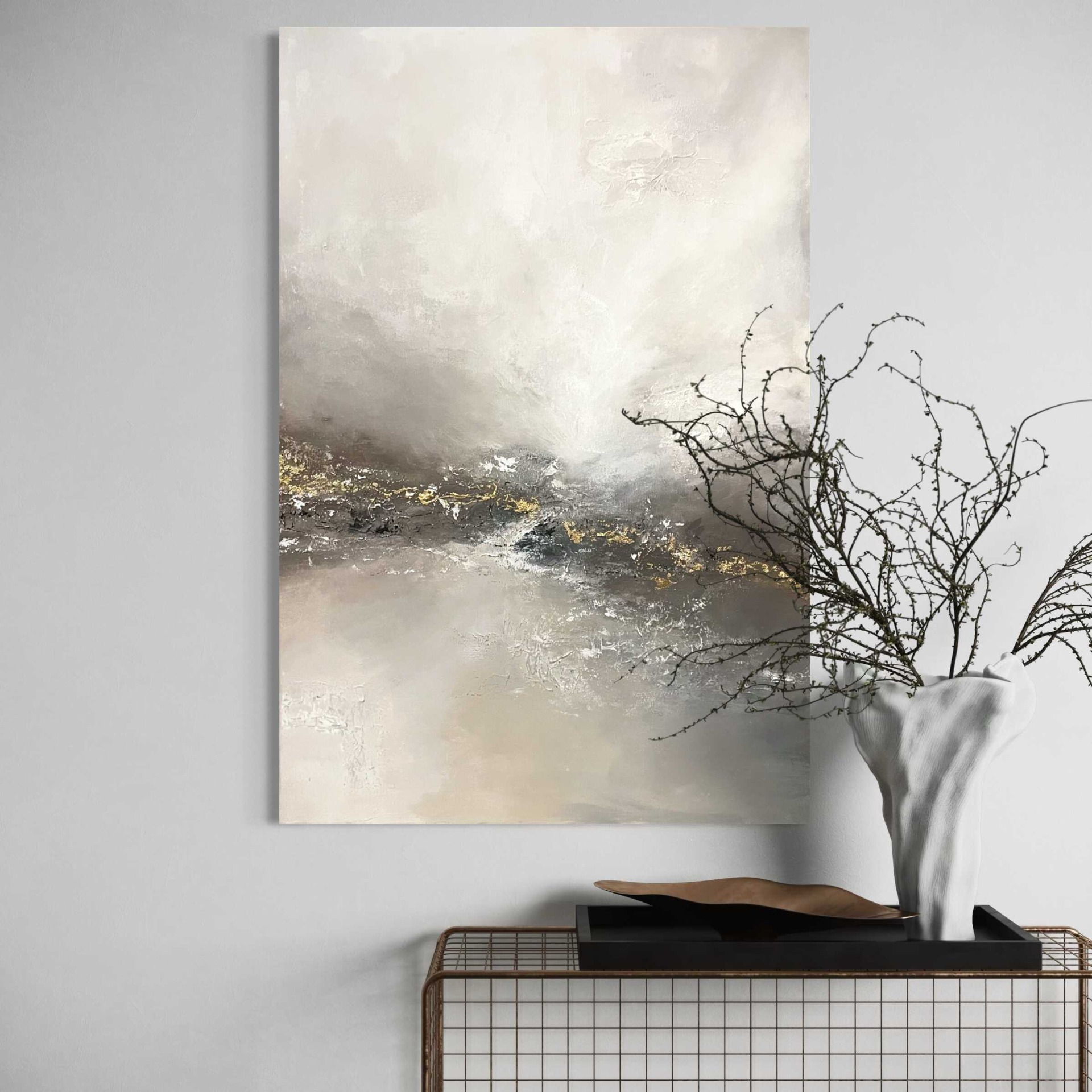 Absztrakt márvány hatású festmény szürke és bézs tónusokkal modern enteriőrben